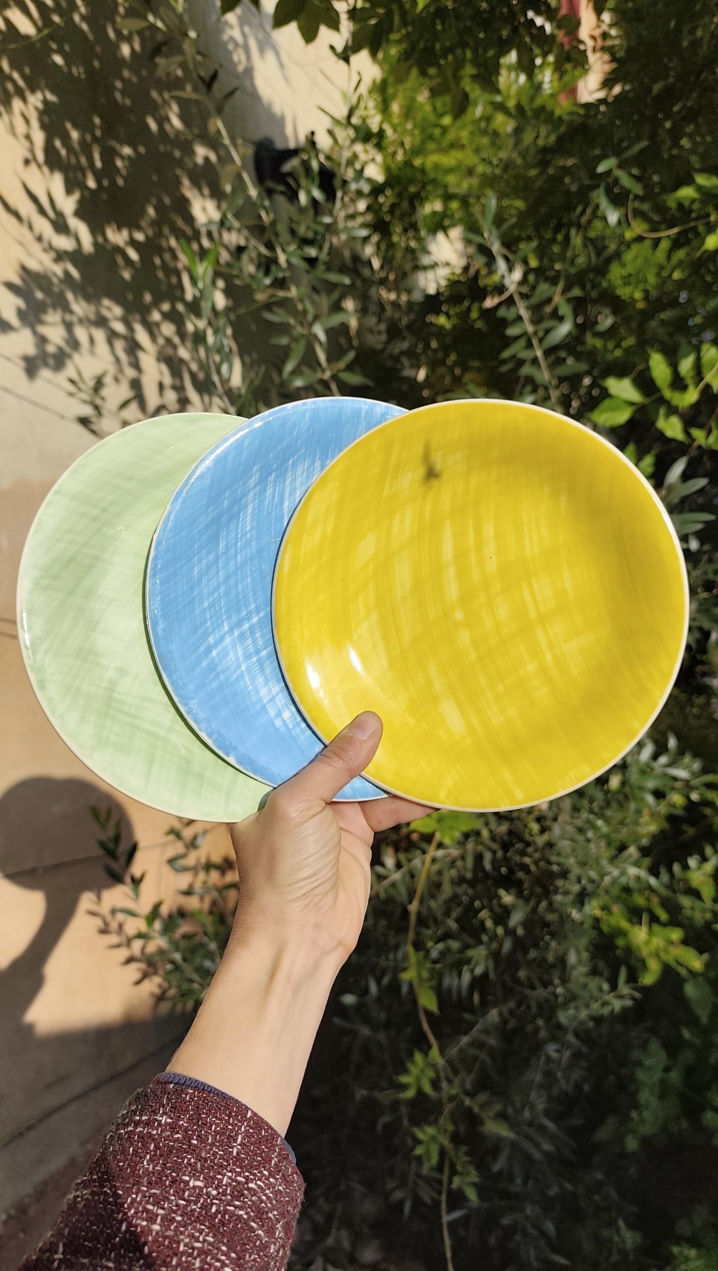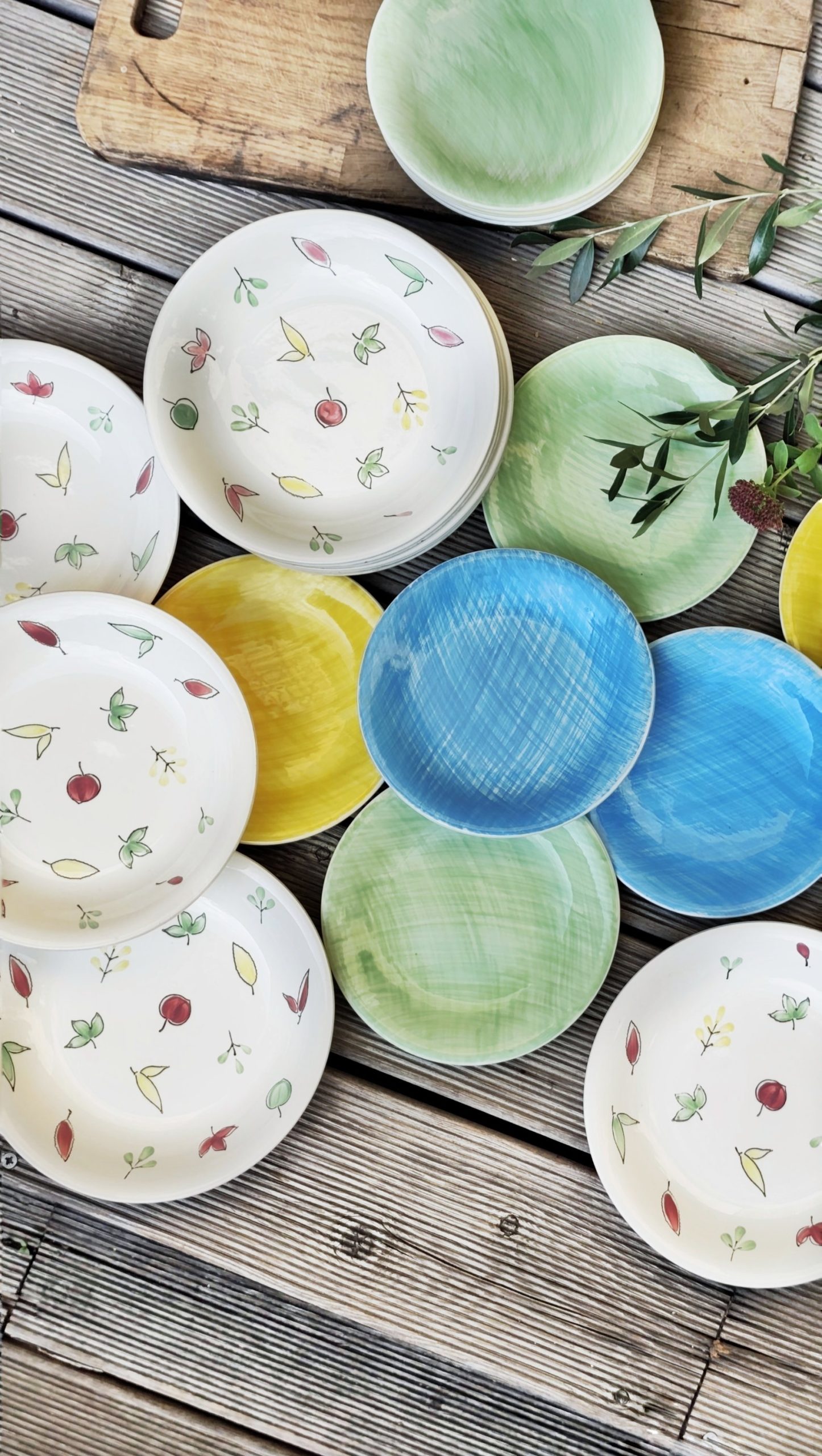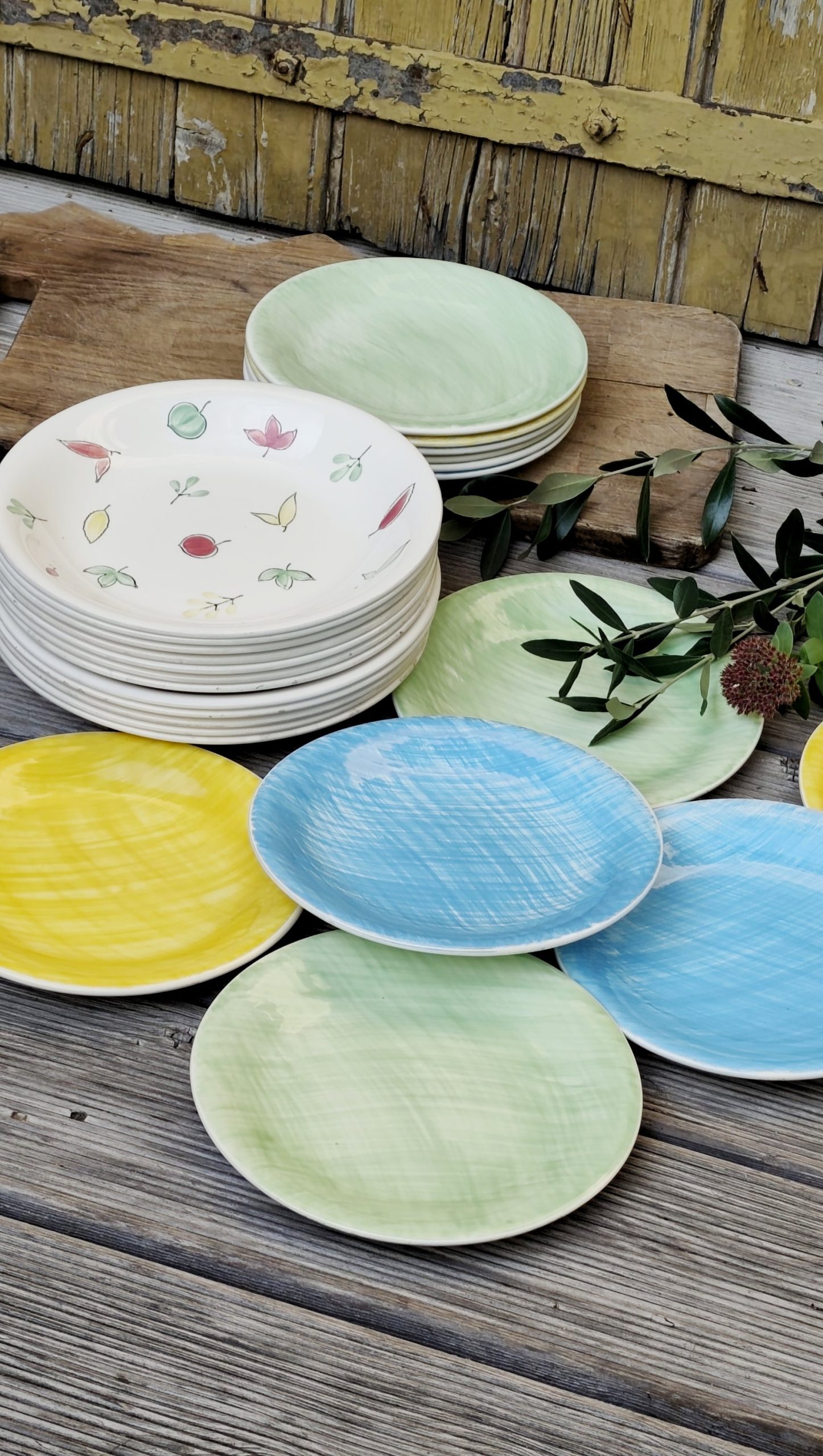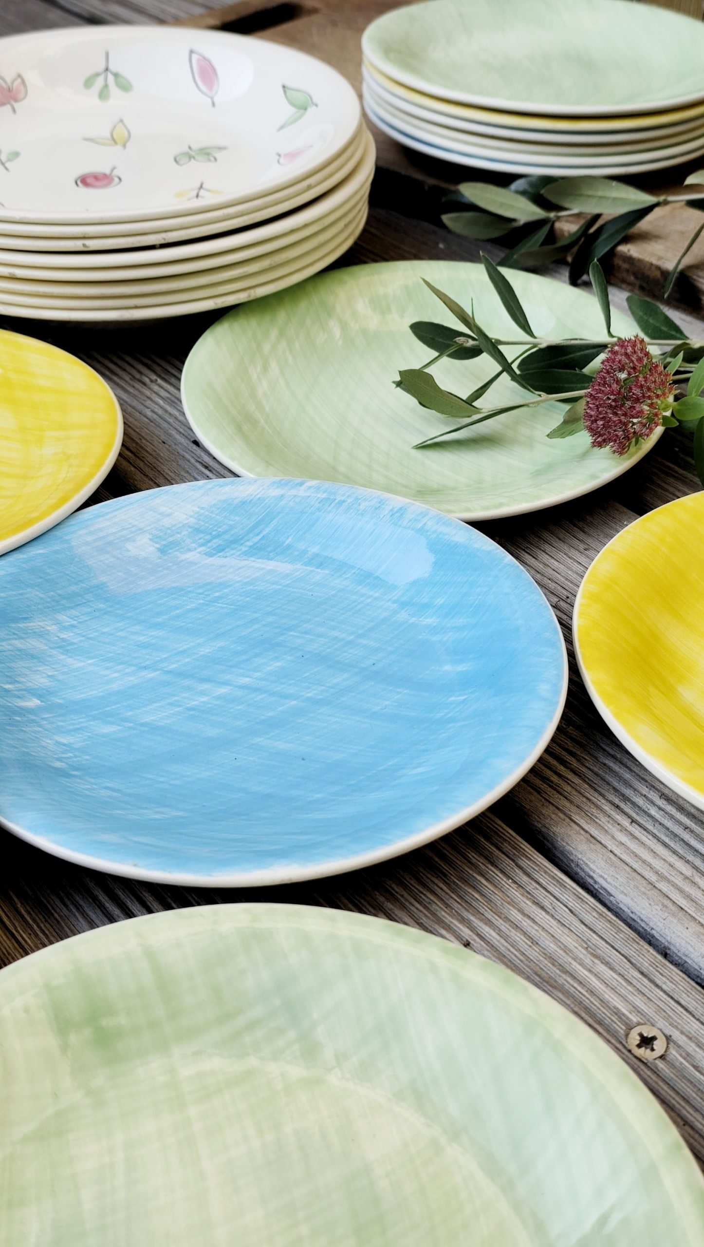 Ensemble ultra coloré de 6 assiettes à dessert ancienne, modele Mistral, Salins.