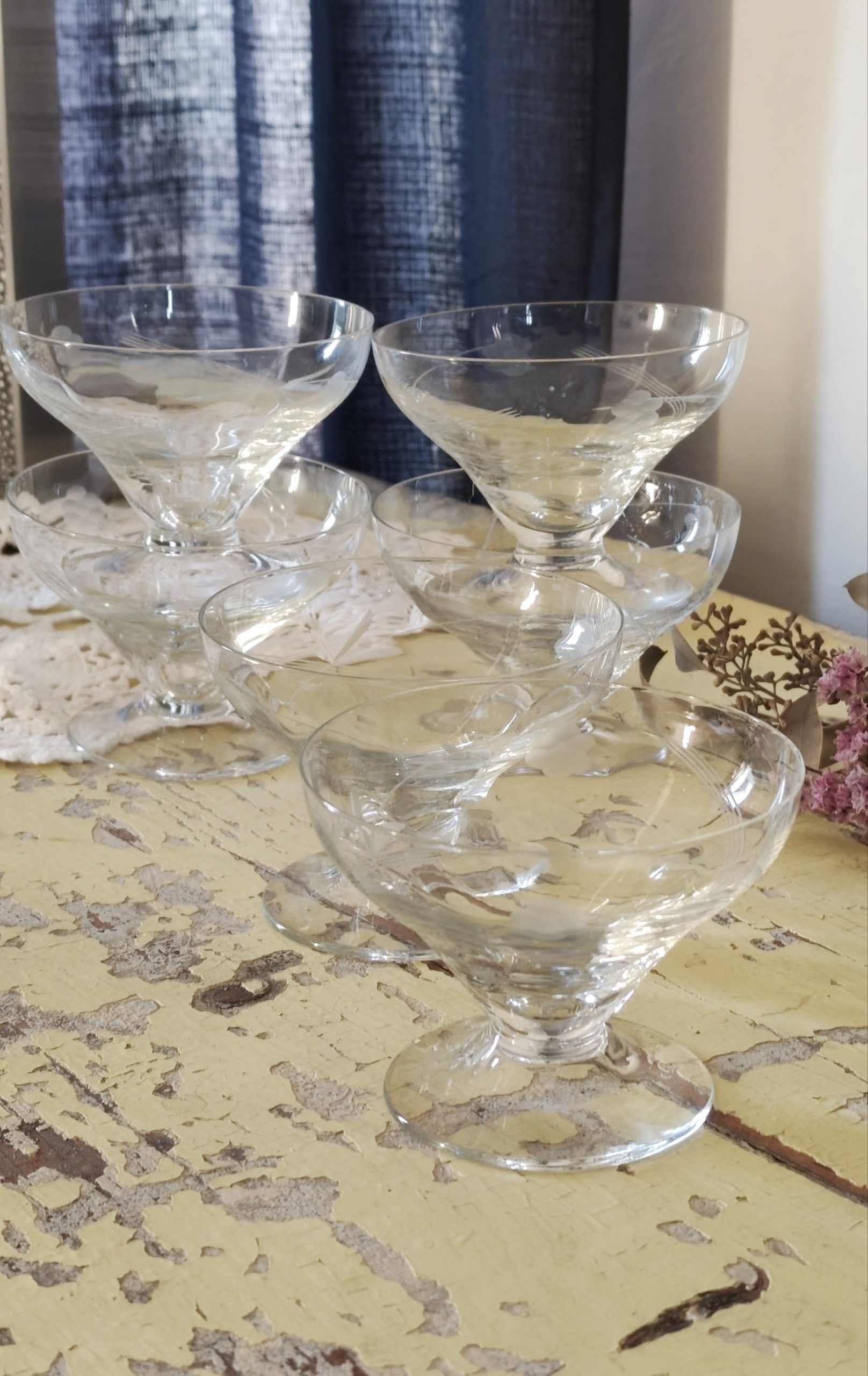 Ensemble de très jolies anciennes coupes à champagne évasées. Un modèle très populaire pendant l’entre-deux-guerres et jusqu’aux années 50 60.