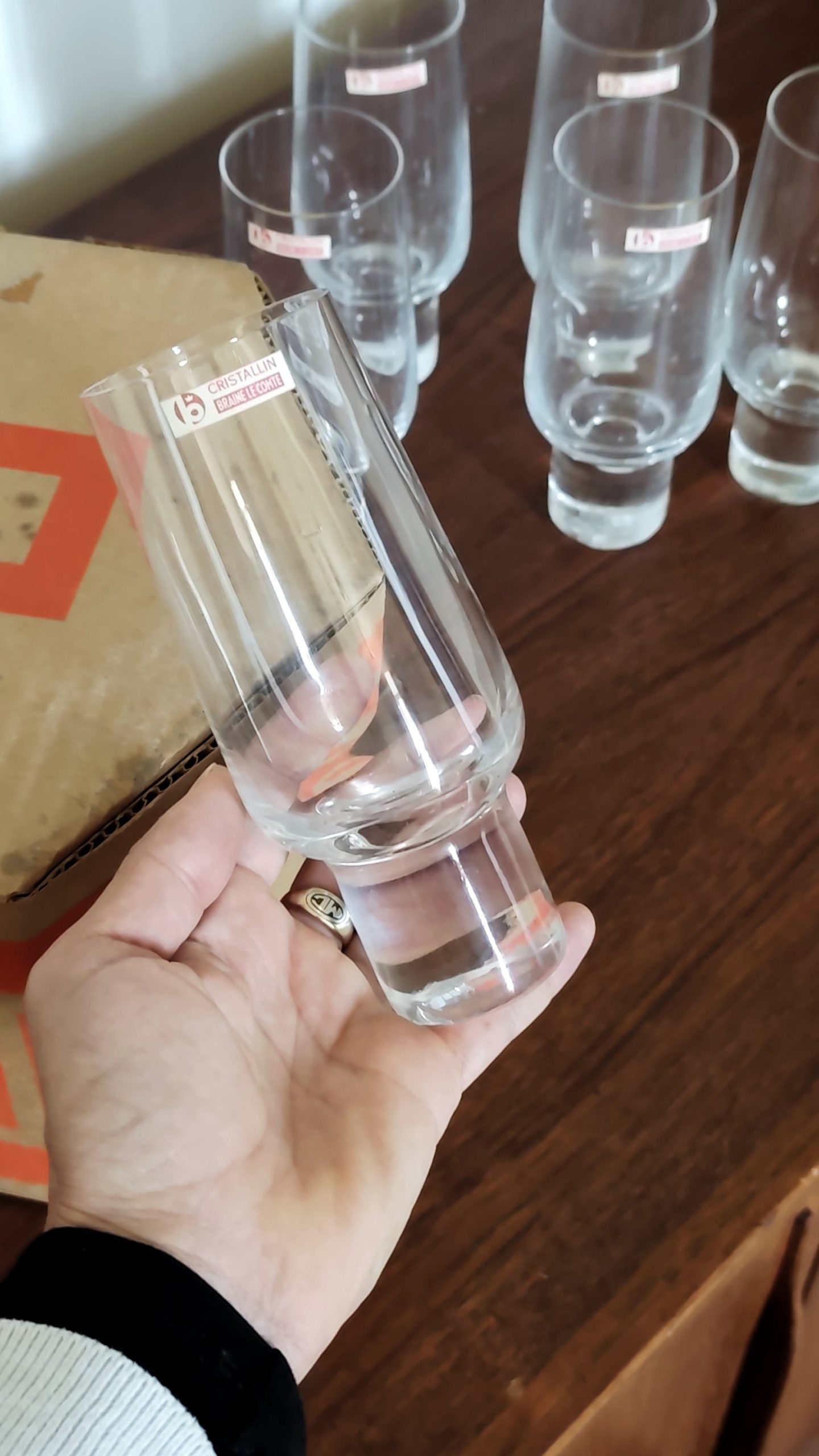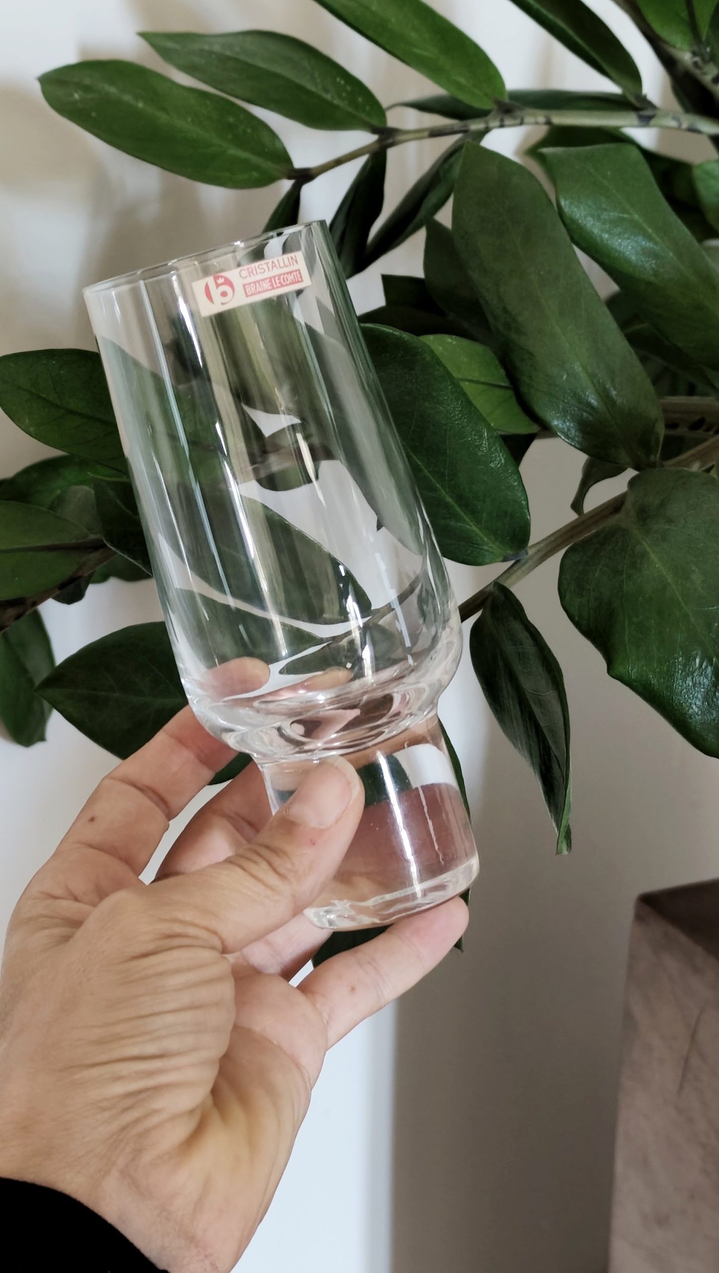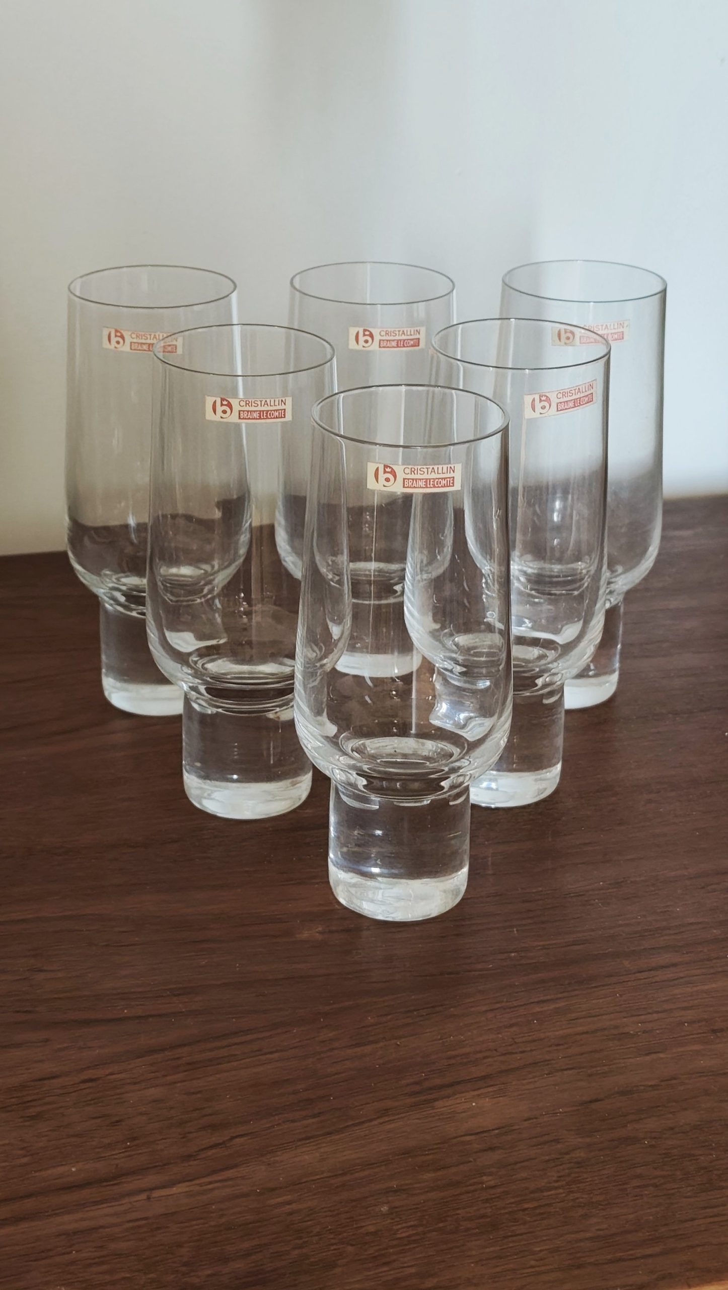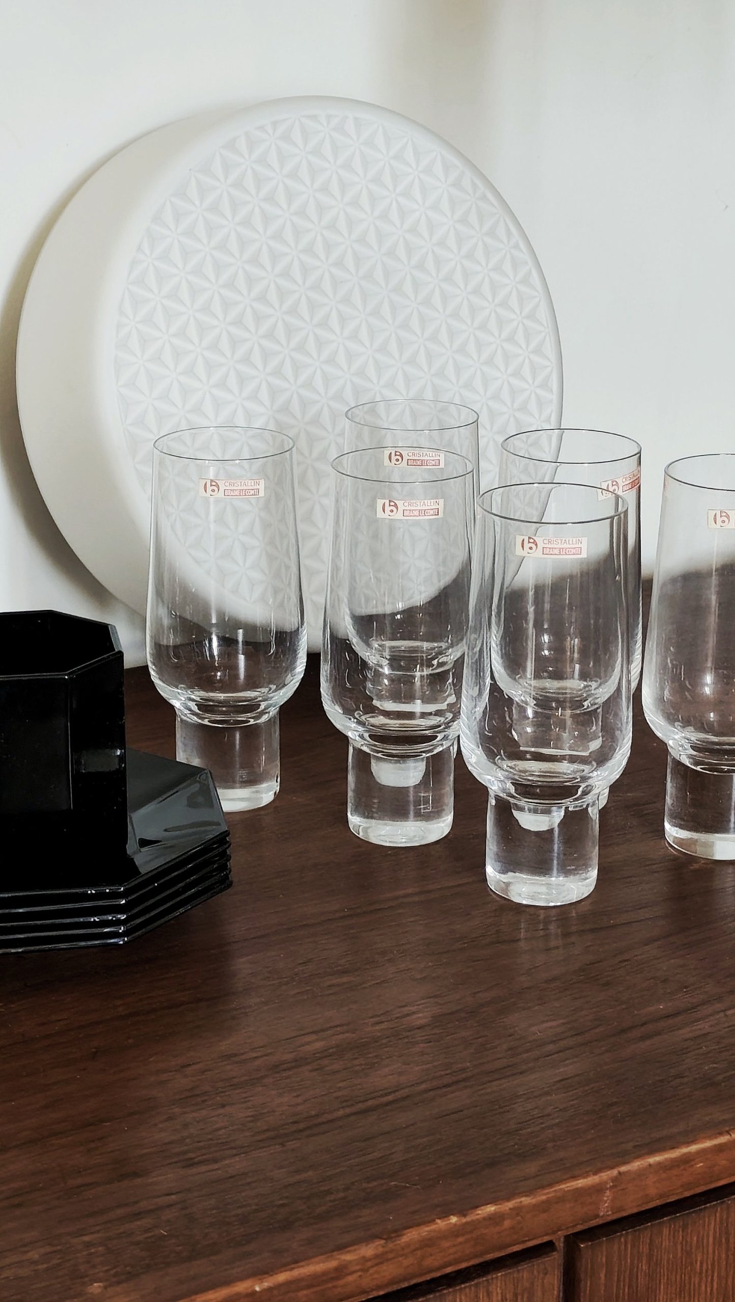 Verres en cristallin clair, au design élégant typique des années 70-80 : pied massif, ligne fine et épurée.