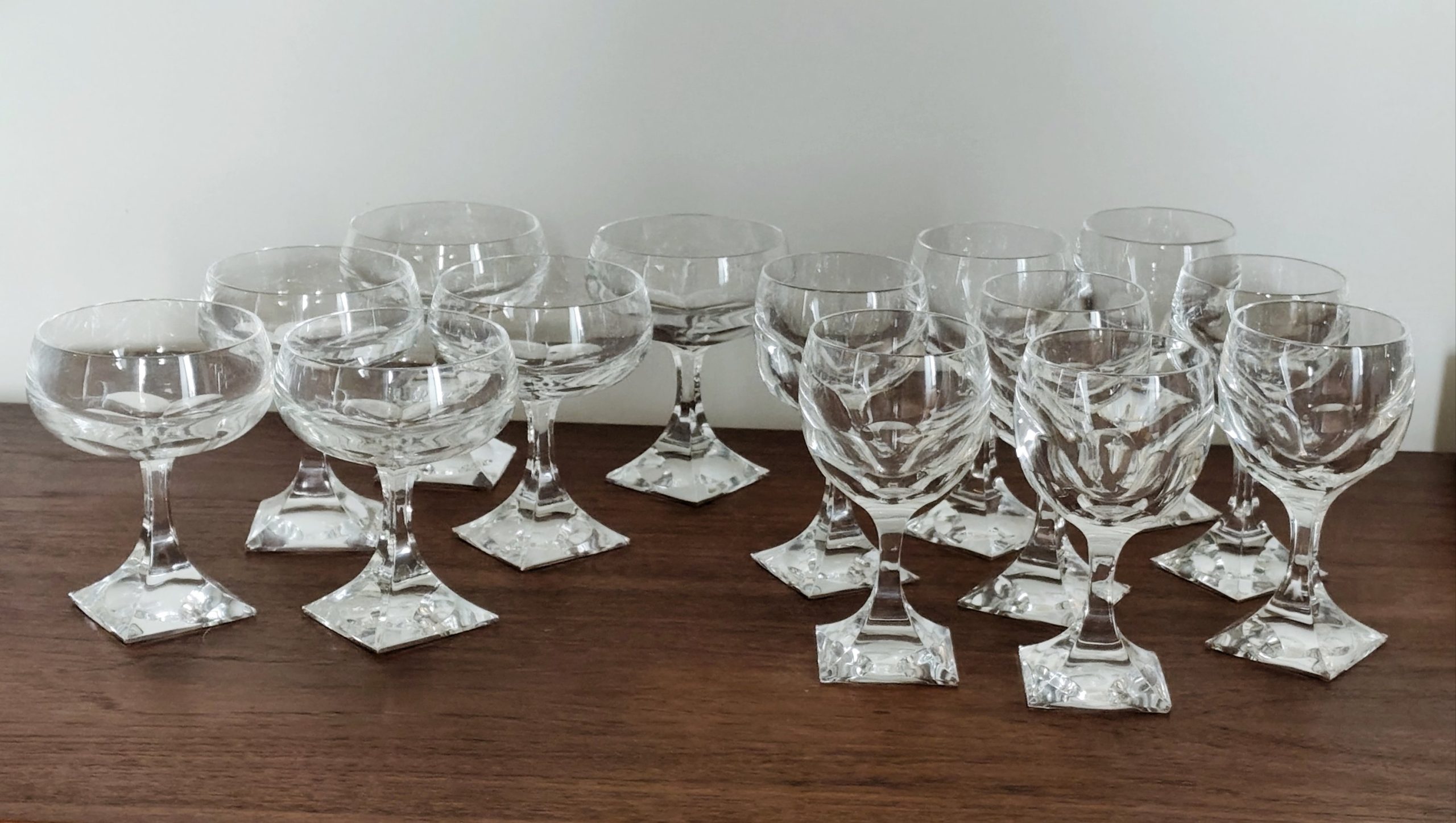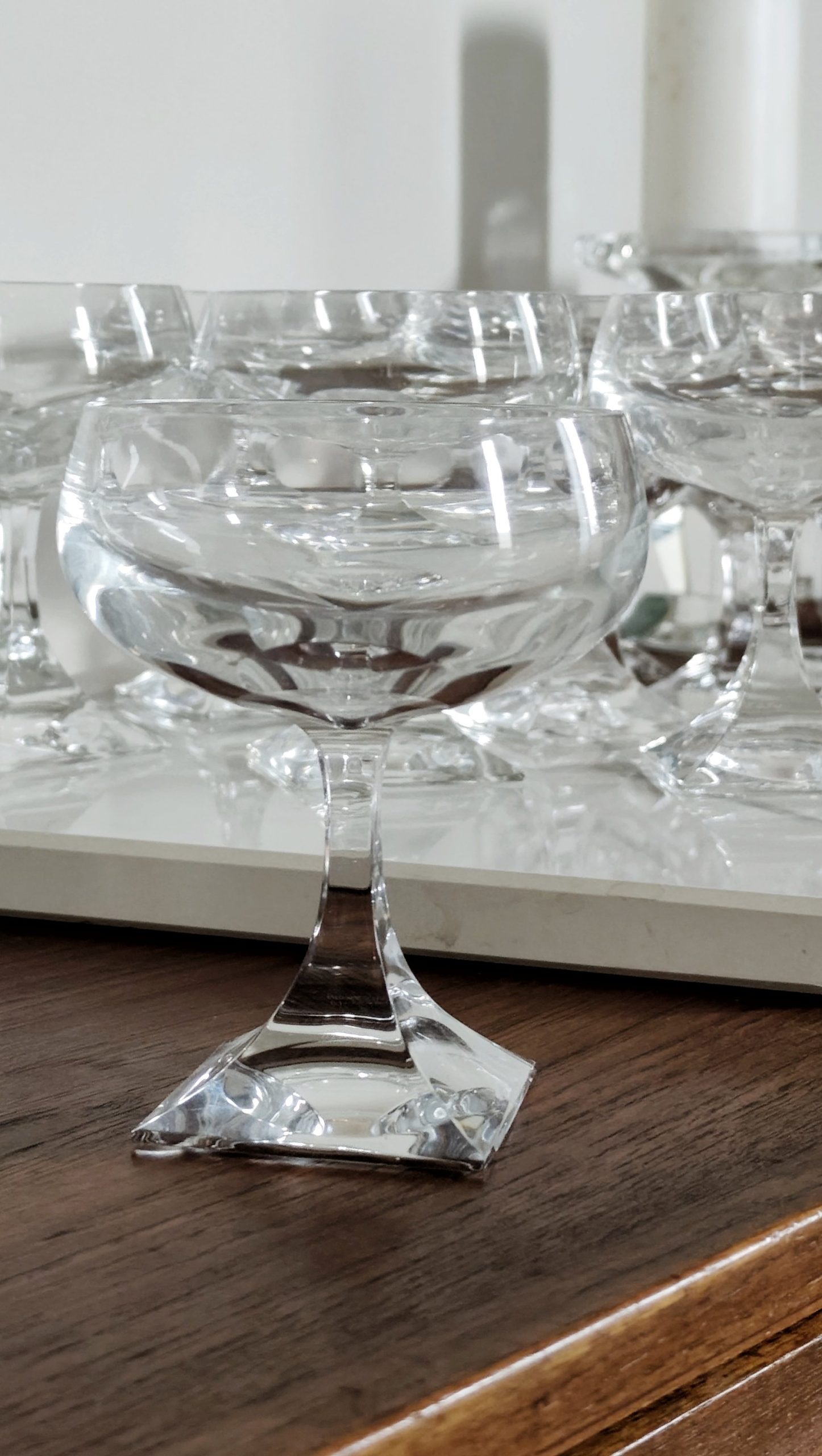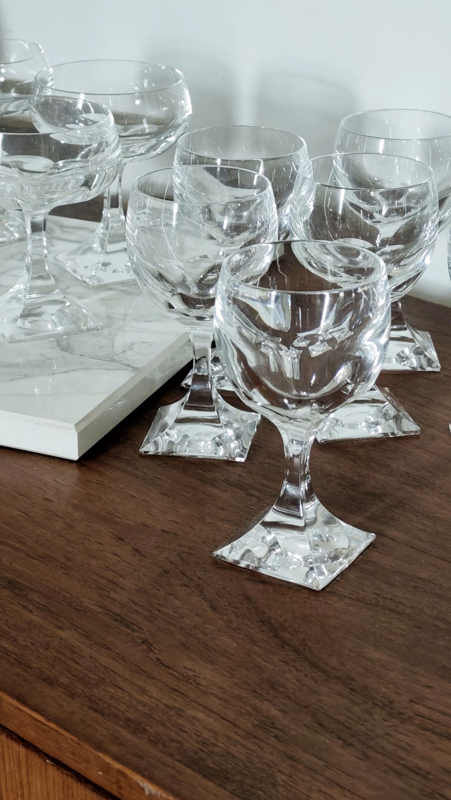 6 coupes et 6 verres à vin en excellent état + 2 verres à vin avec toute petite écaille discrète sur l’arête inférieure de leur socle carré, n’affectant en rien leur stabilité ni leur beauté visuelle (défaut pris en compte dans le prix de vente). (cf photos).