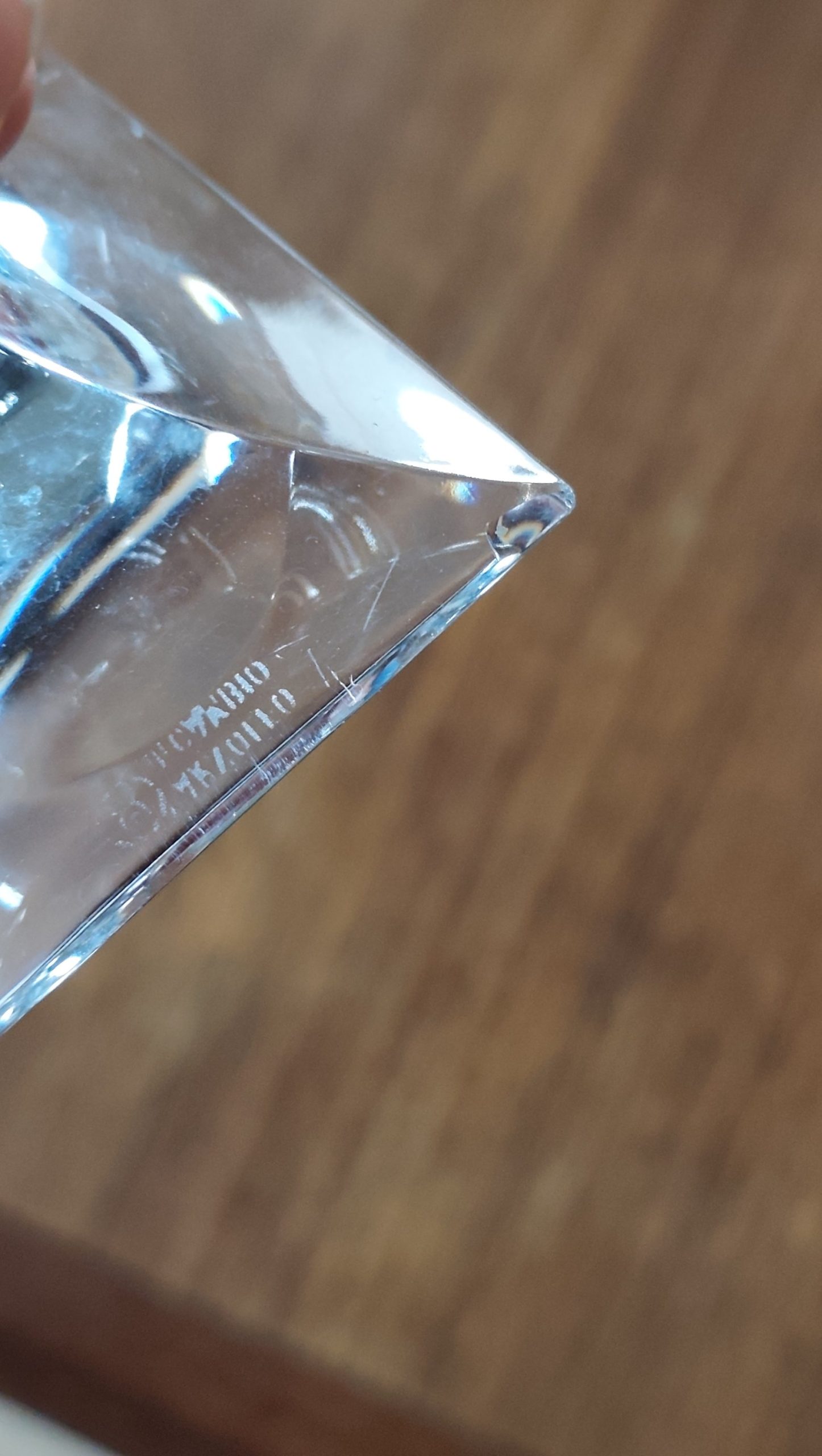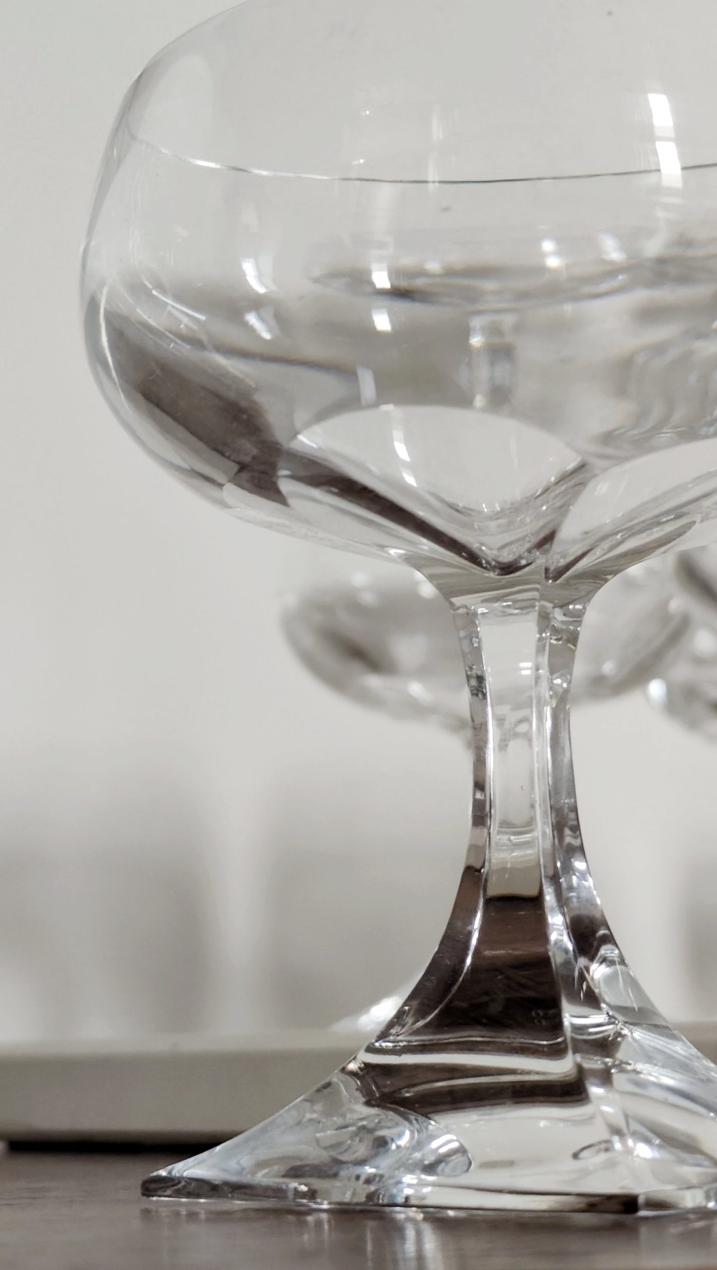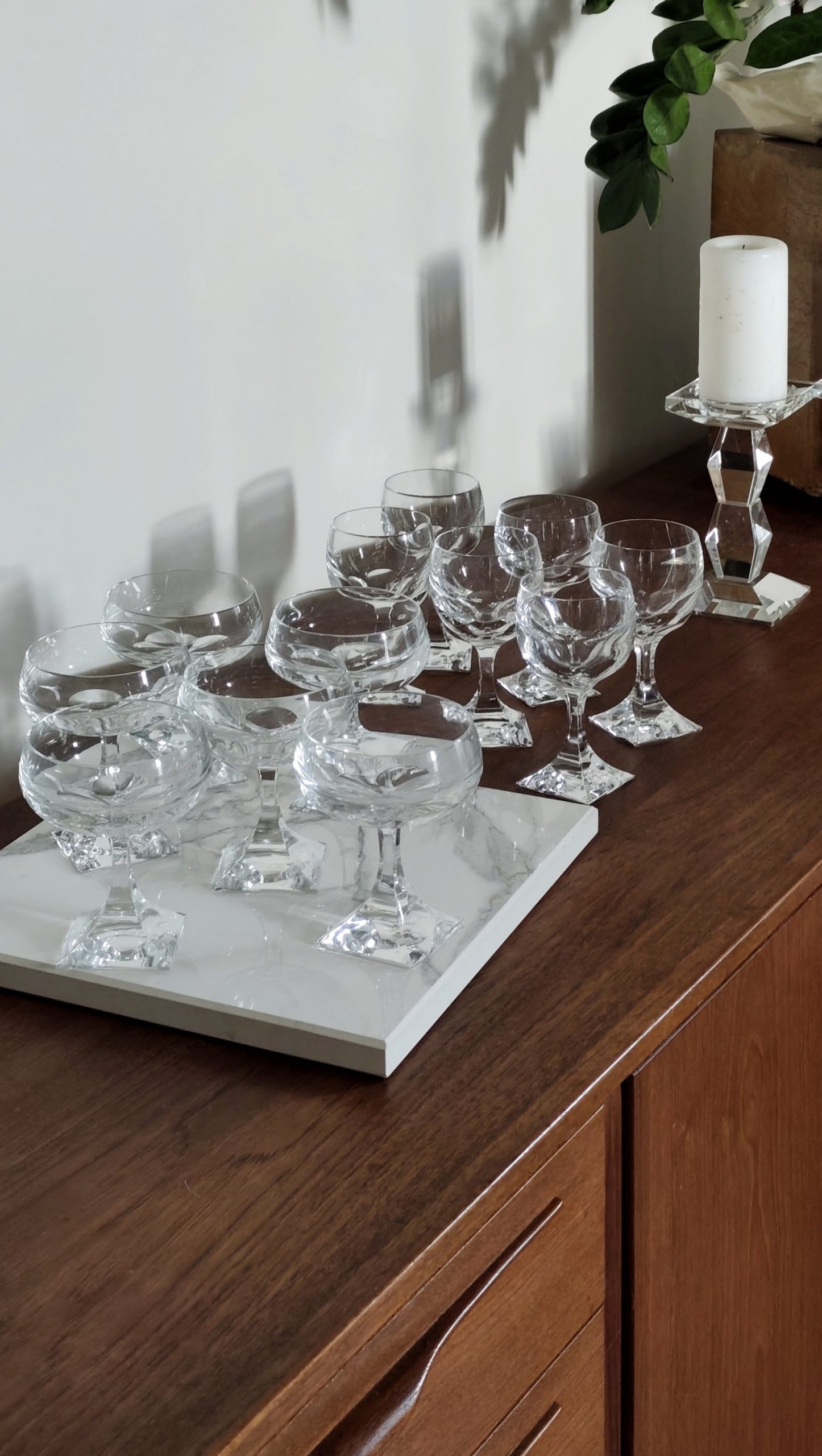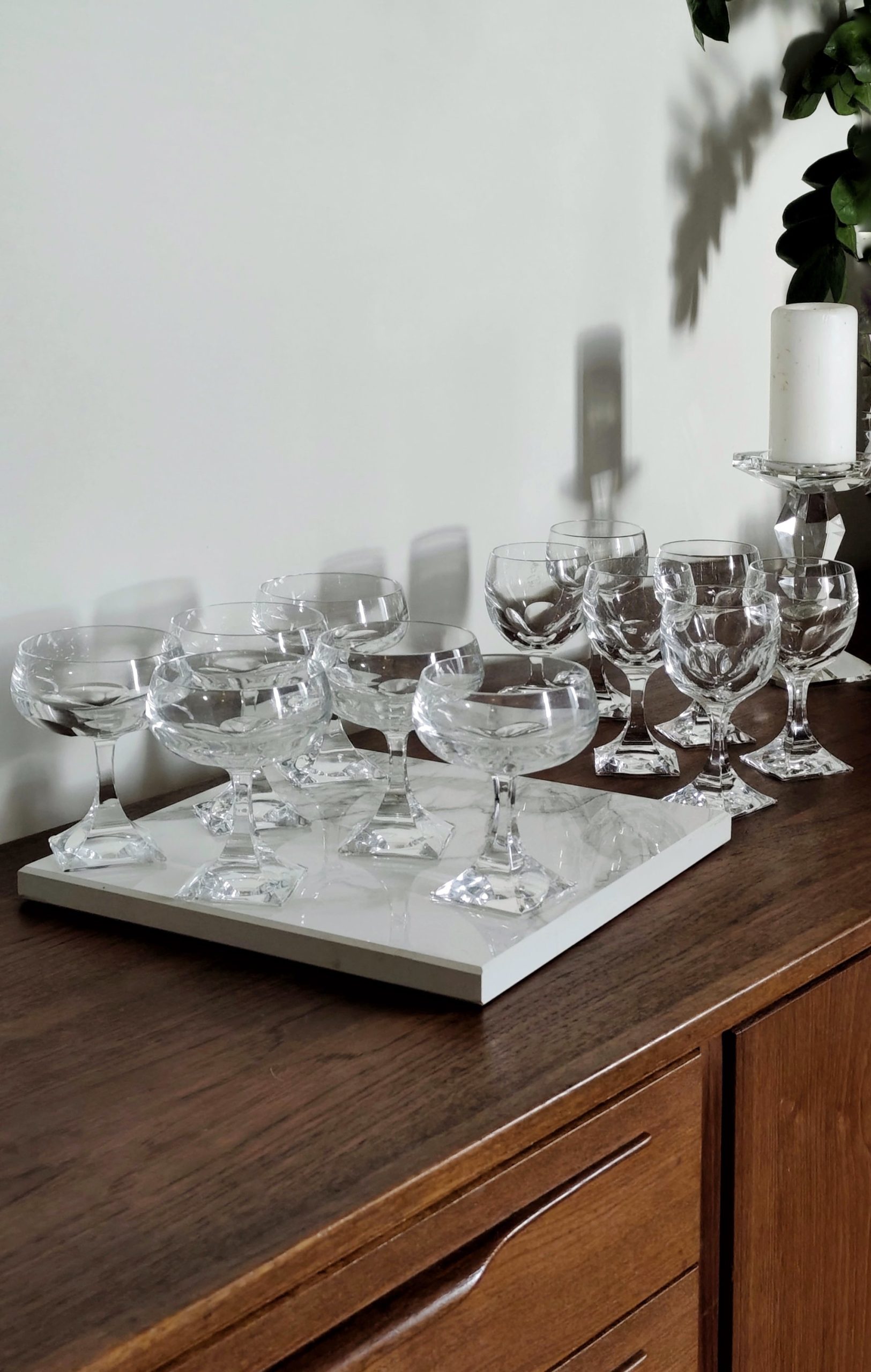 6 coupes et 6 verres à vin en excellent état + 2 verres à vin avec toute petite écaille discrète sur l’arête inférieure de leur socle carré, n’affectant en rien leur stabilité ni leur beauté visuelle (défaut pris en compte dans le prix de vente). (cf photos).