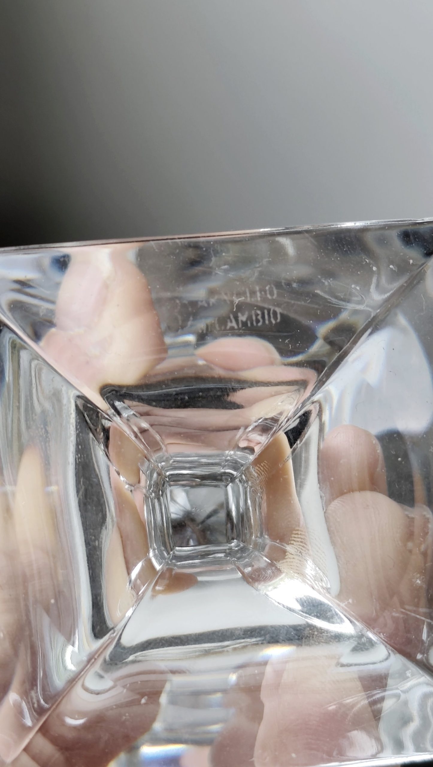 Ces pièces emblématiques incarnent parfaitement le design géométrique et brutaliste de l’époque, caractérisé par leur silhouette élégante et leur base carrée et massive. Conçus par le bureau technique interne d’Arnolfo di Cambio, ces verres arborent la prestigieuse taille « taglio 1000 » (ou « taglio coste »), assurant un éclat et une prise en main uniques. L’ensemble est en excellent état général et représente une magnifique opportunité pour les amateurs de design Mid-Century Modern ou de collection de verrerie italienne haut de gamme