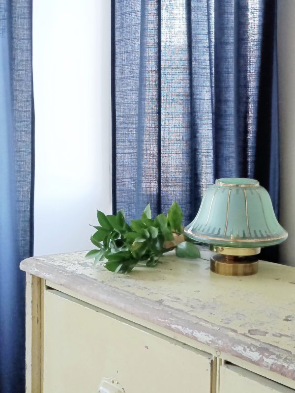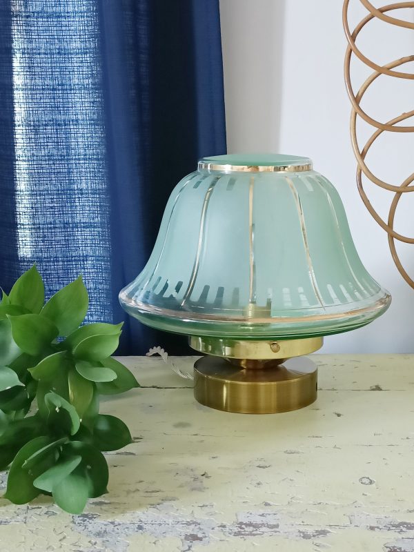 Lampe à poser réalisée à partir d’un grand globe (taille XL) ancien en verre vert et orné de dorures, autrefois utilisé en plafonnier.