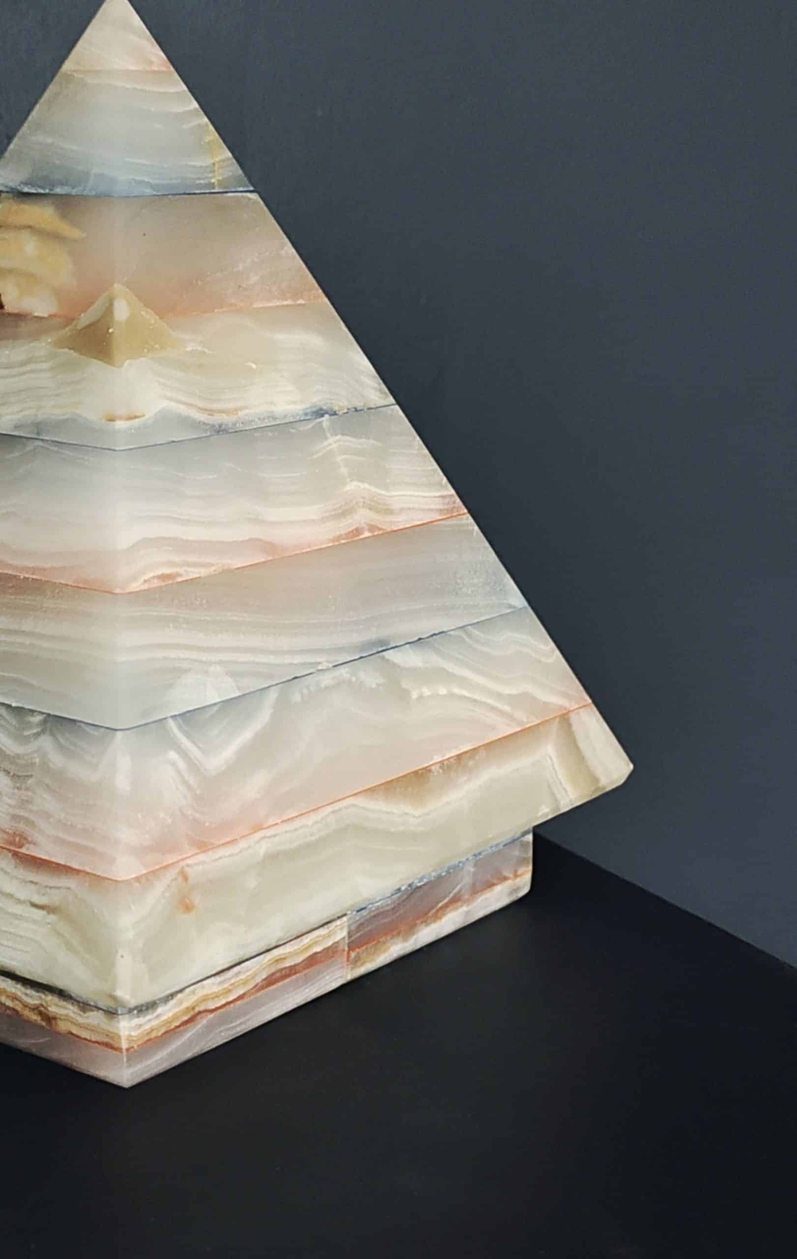 Lampe pyramidale en onyx. celle-ci avec son câble doré métallisé, sort typiquement d’un salon des années 70-80.
