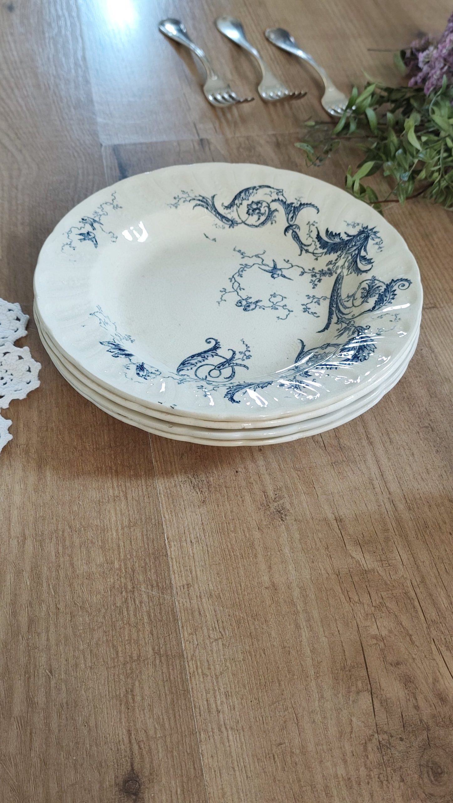 Élégant lot de quatre assiettes creuses en faïence fine de la manufacture de Gien, modèle Rinceaux.