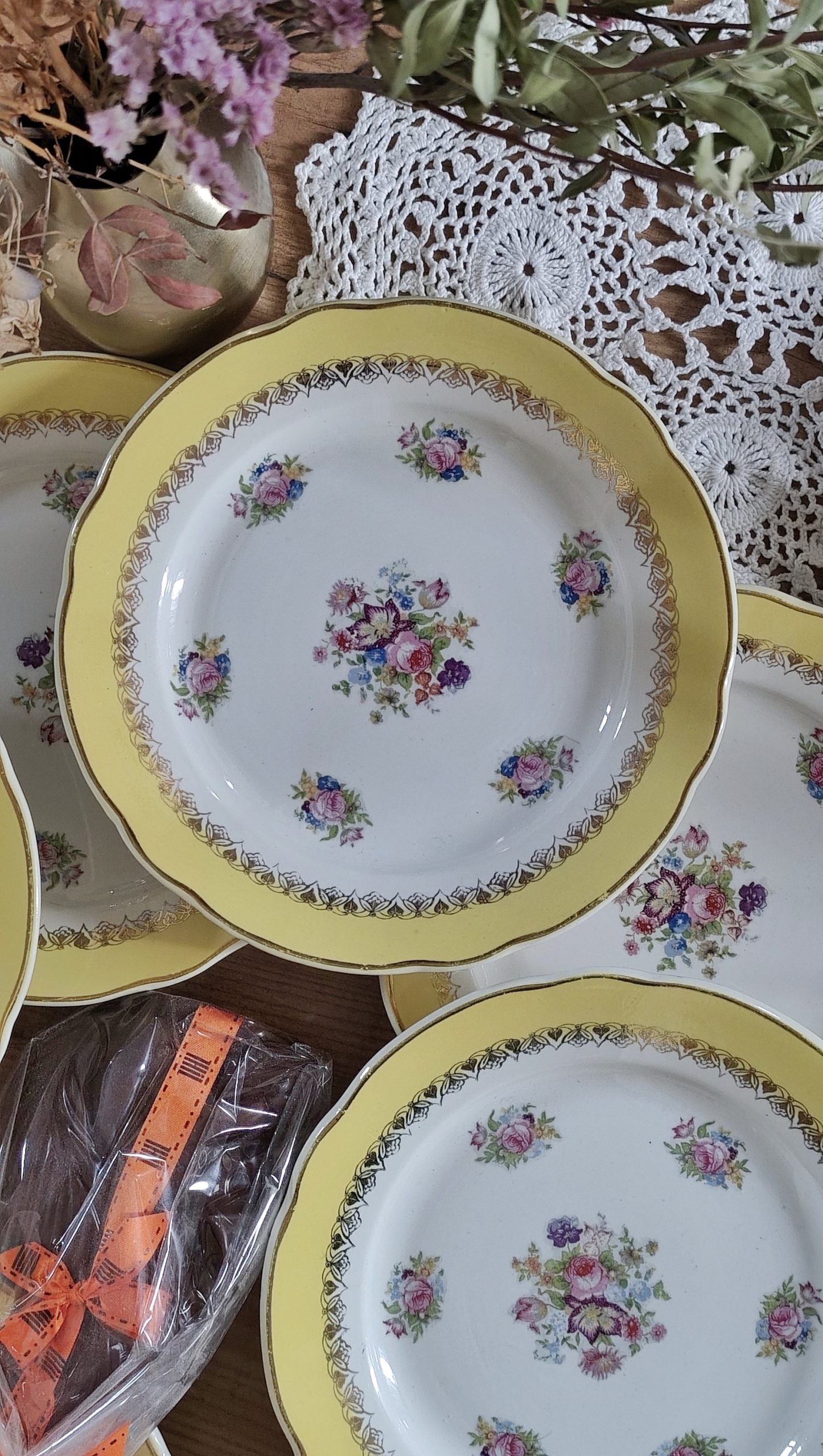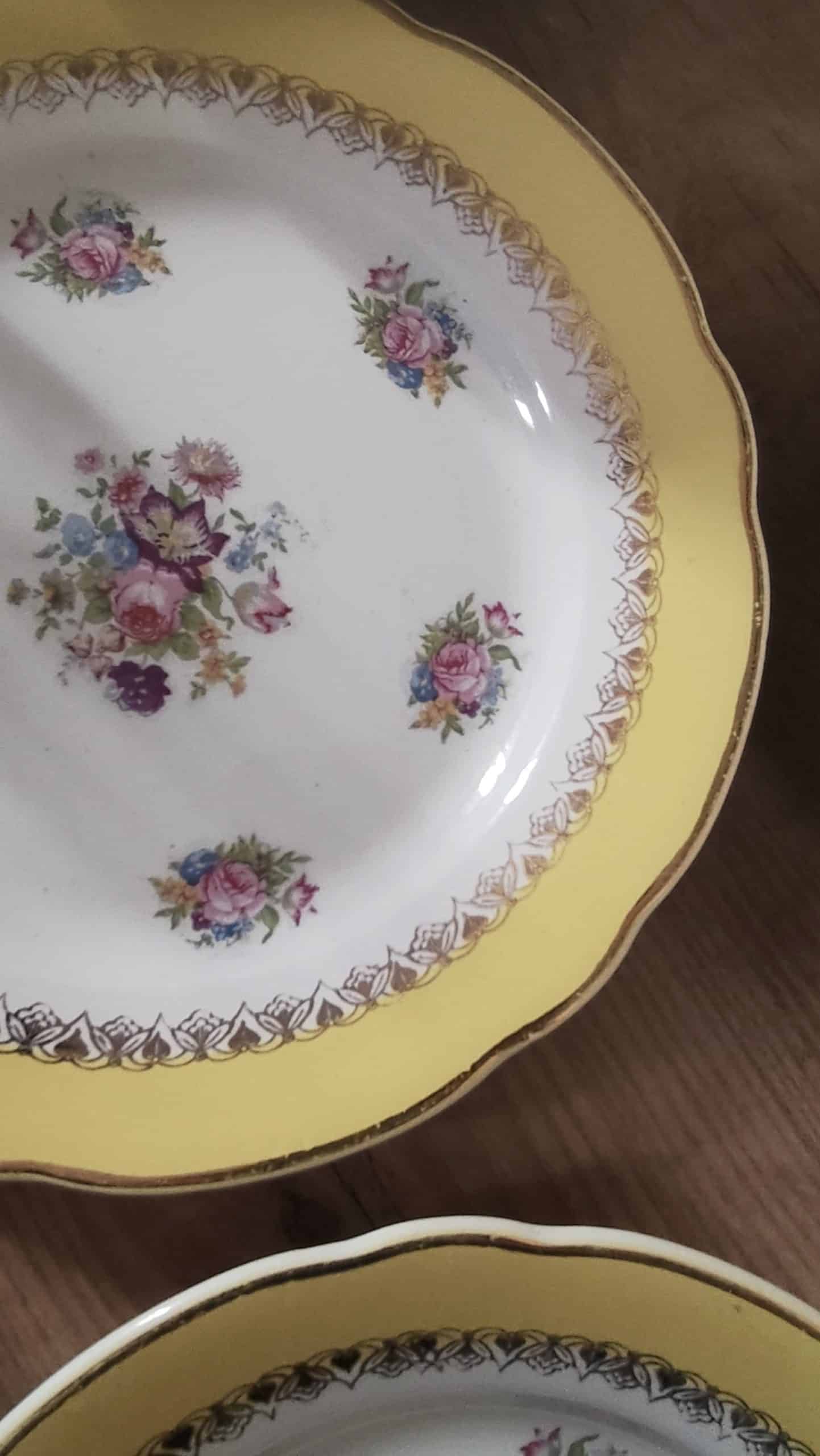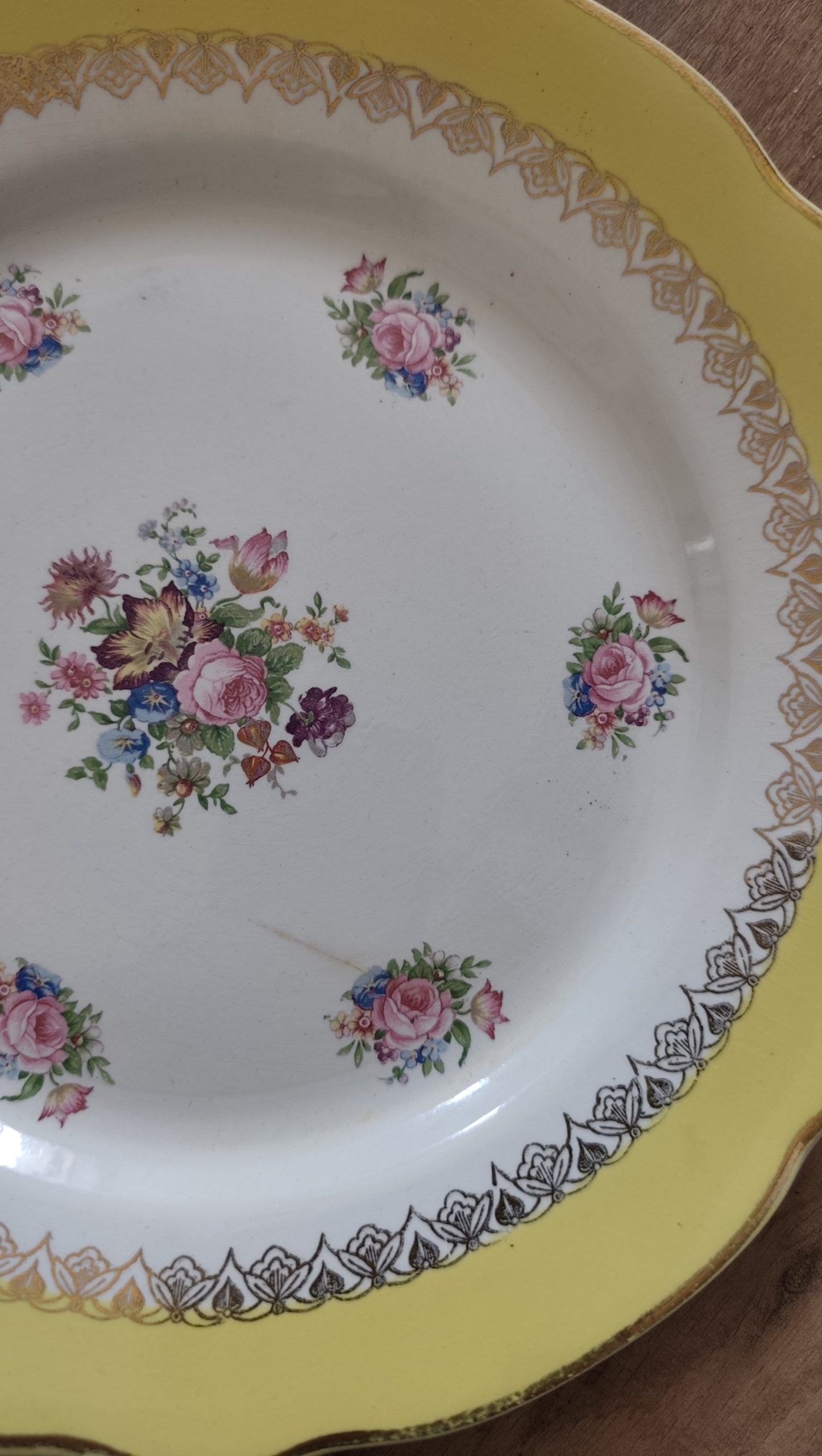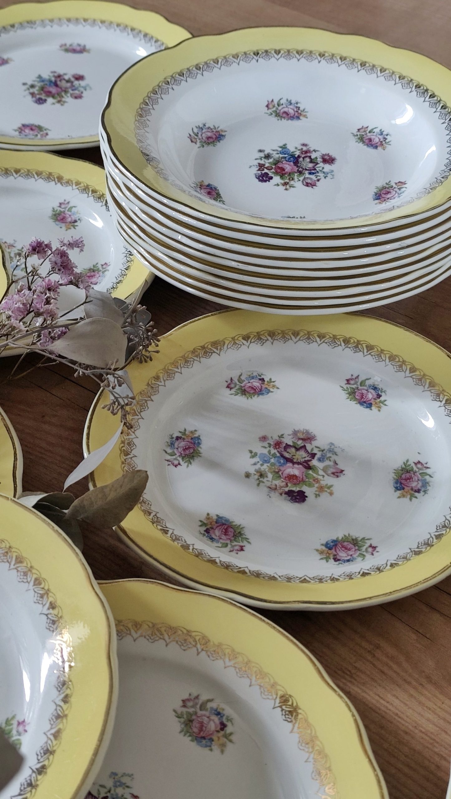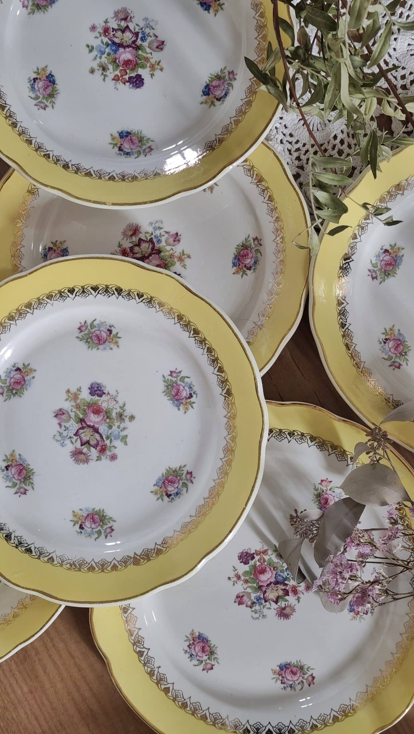 Très bel ensemble de 8 assiettes plates Digoin Sarreguemines dorés de fleurs et d’un très large contour jaune éclatant.