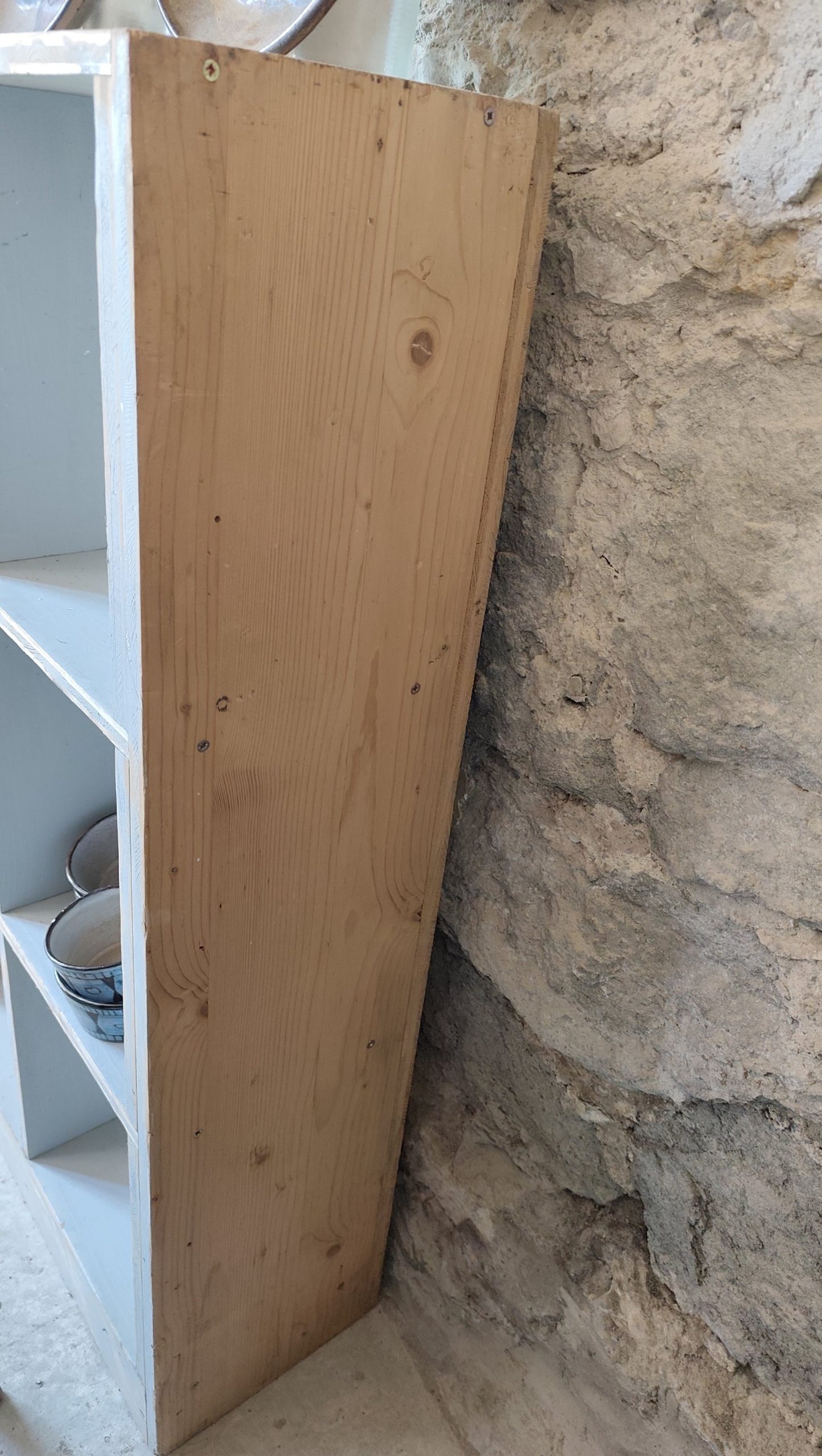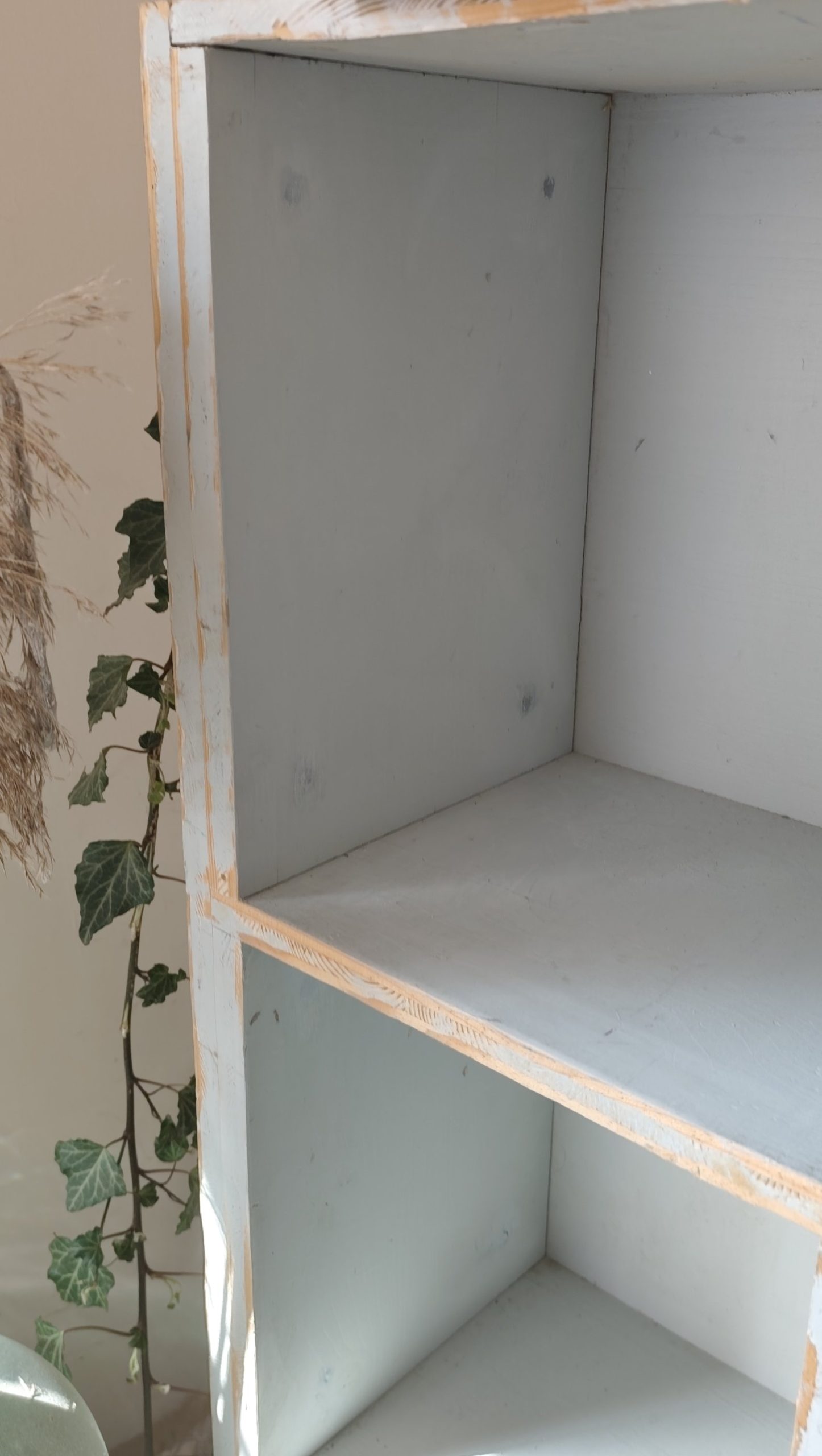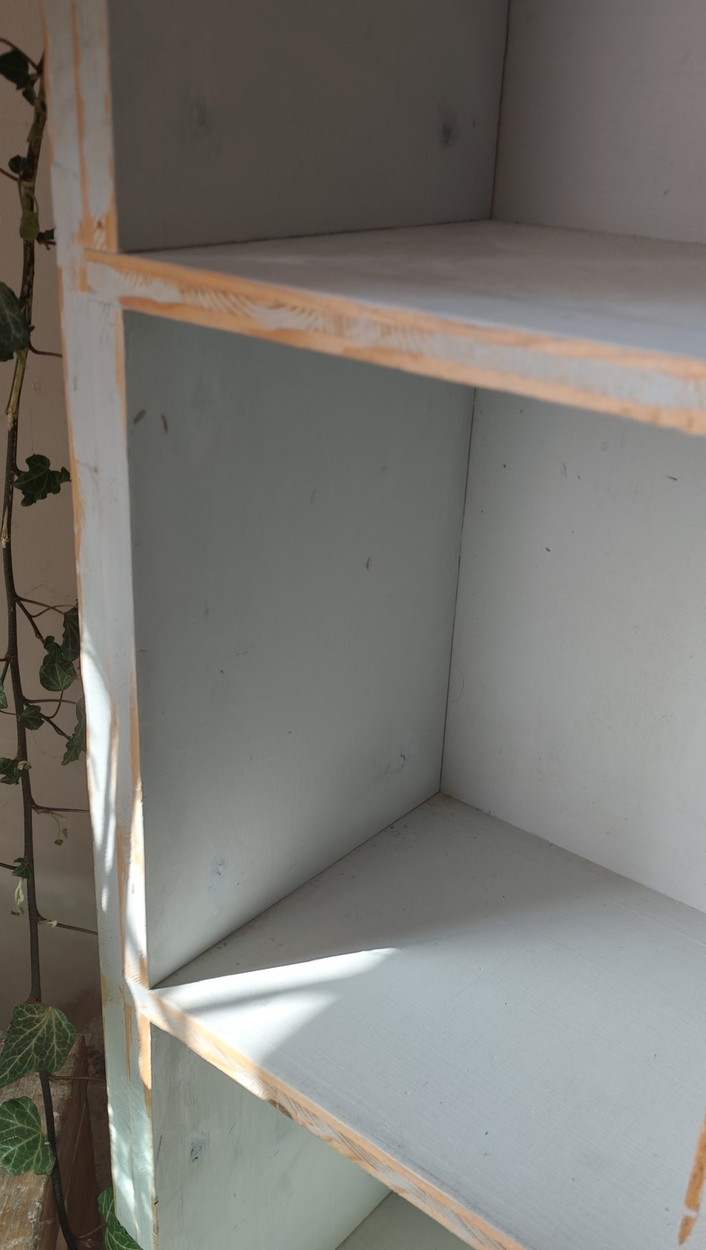 Ancien meuble à casiers en sapin, patine bleu ciel.