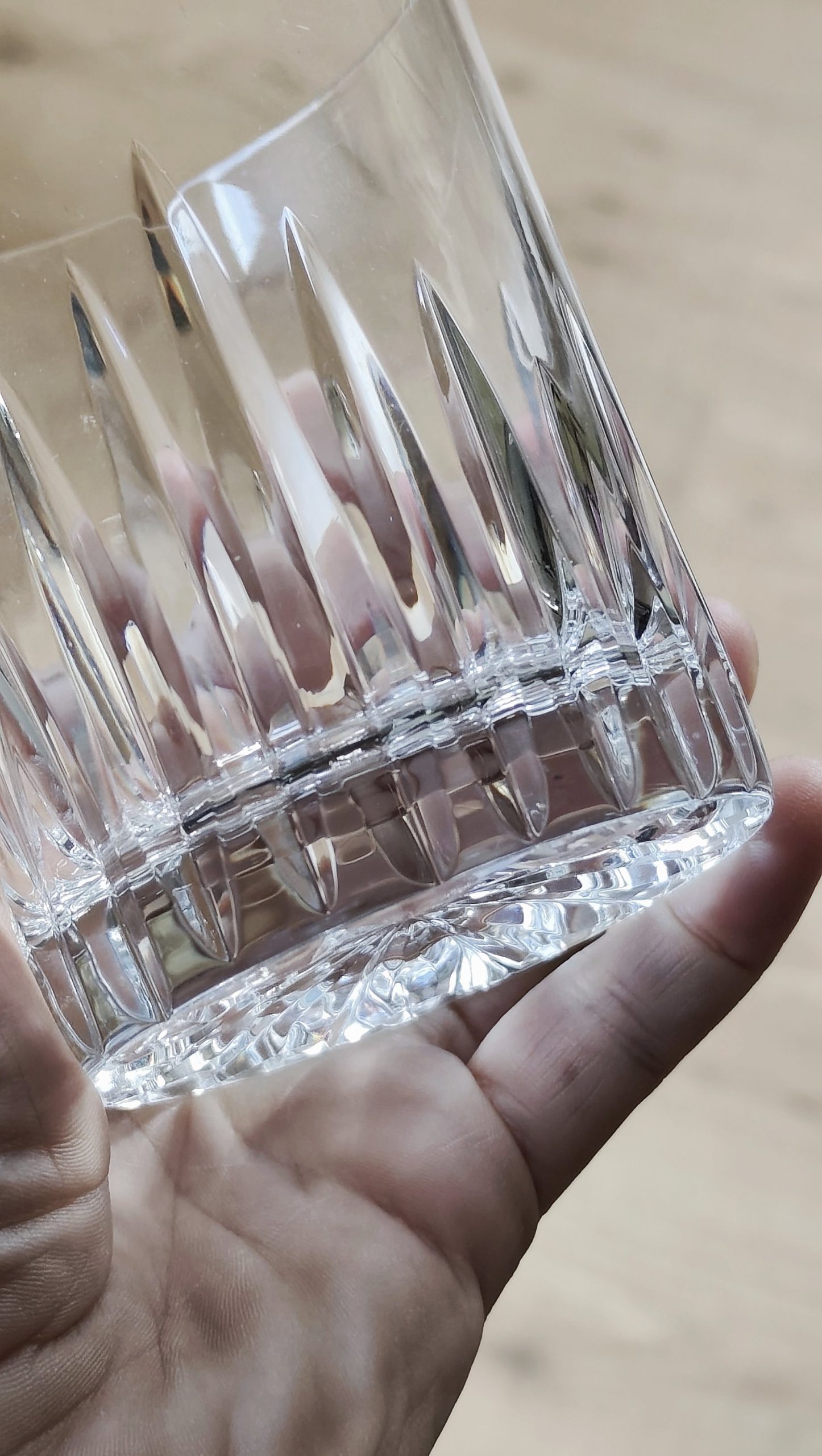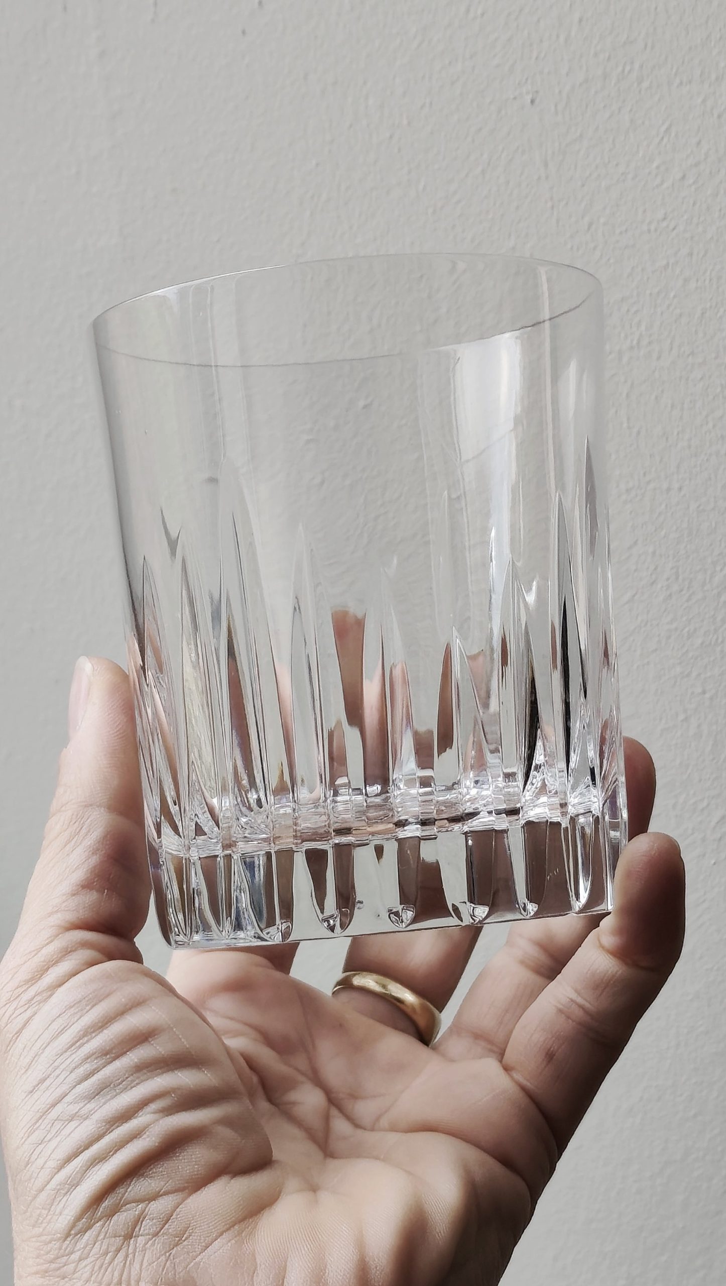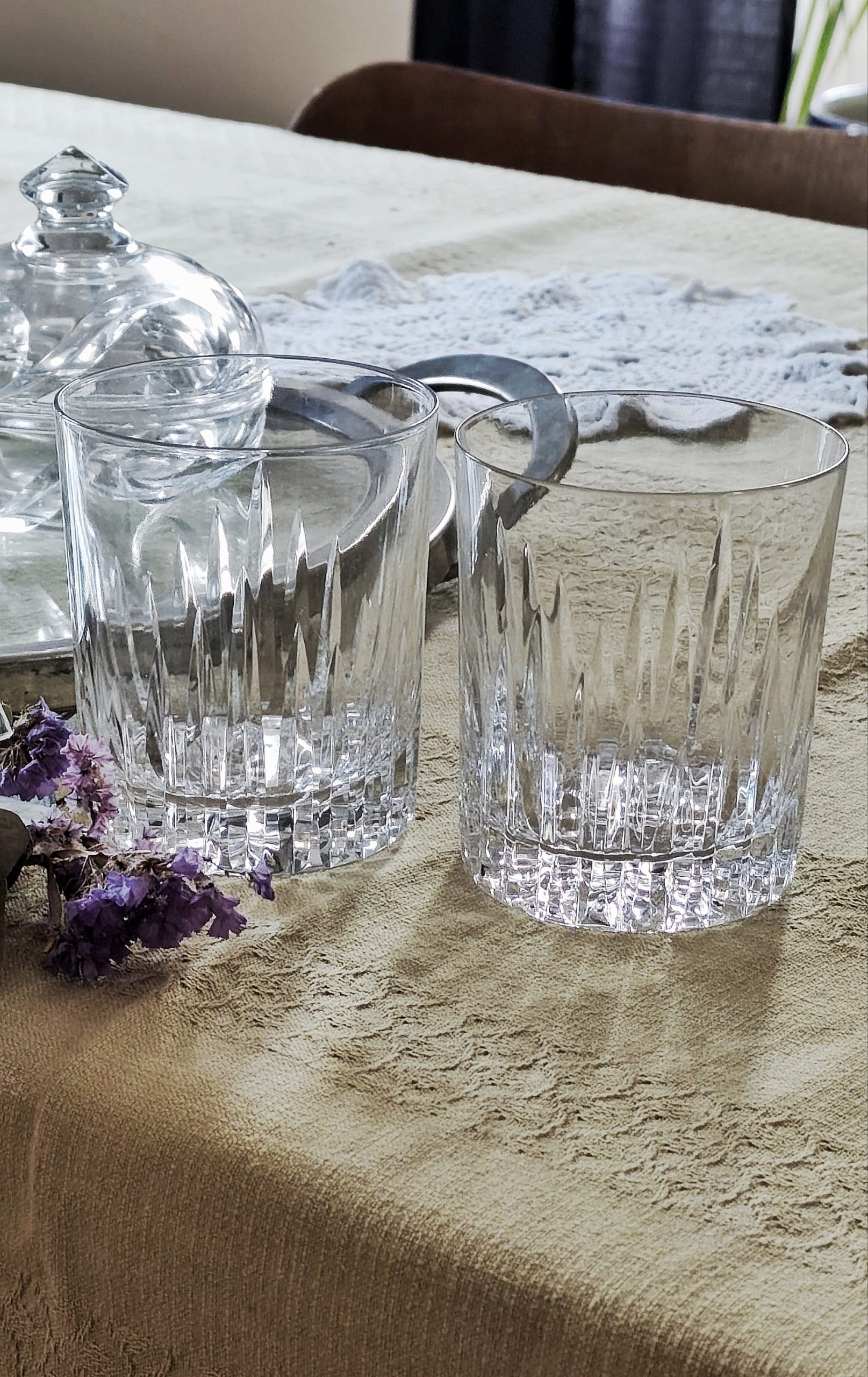 Paire d’anciens verres à whisky en cristal taillé, reflètent parfaitement la lumière. Des pièces datant des années 70 et ayant, sans doute, accompagné de nombreux échanges festifs ou guindés.