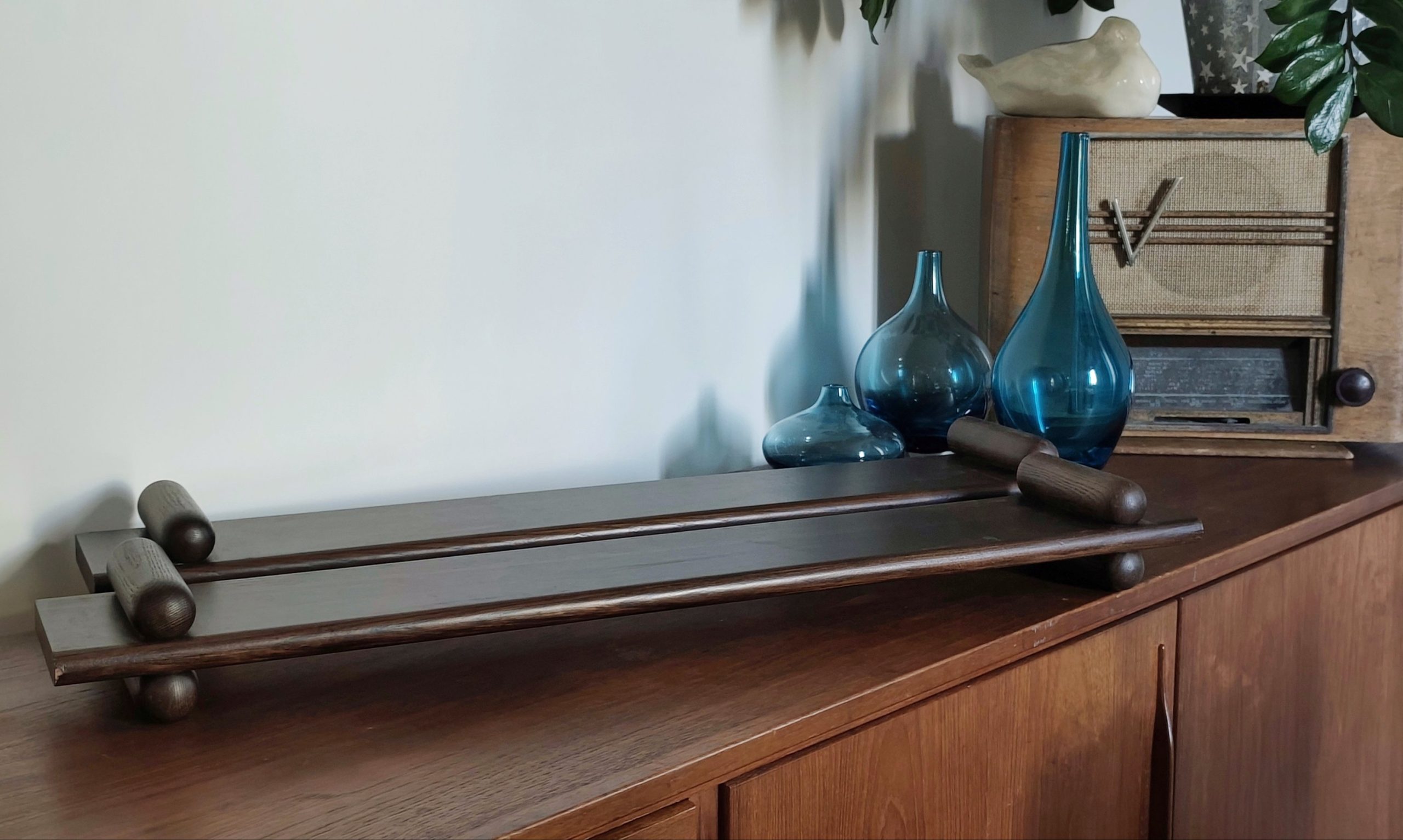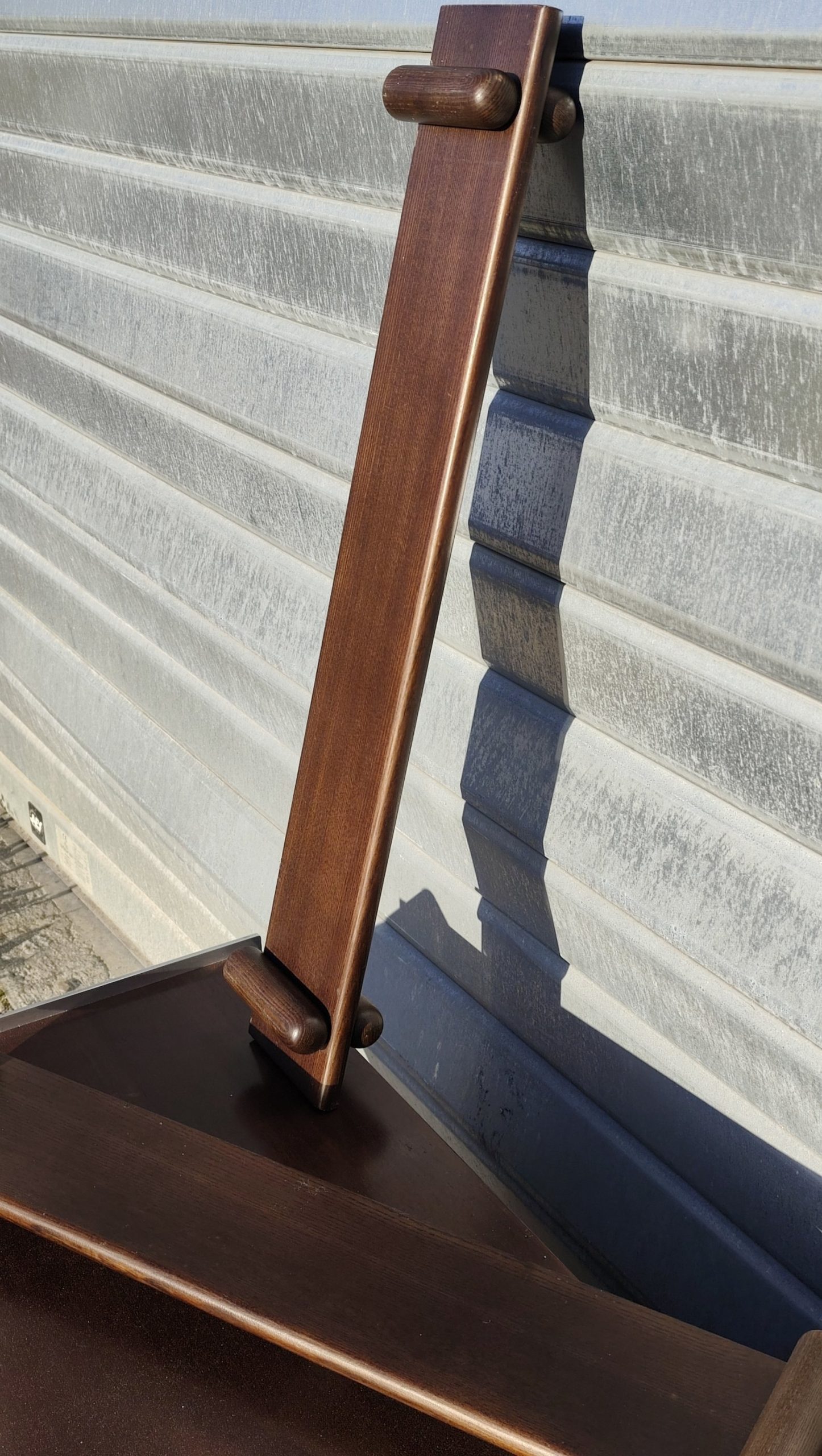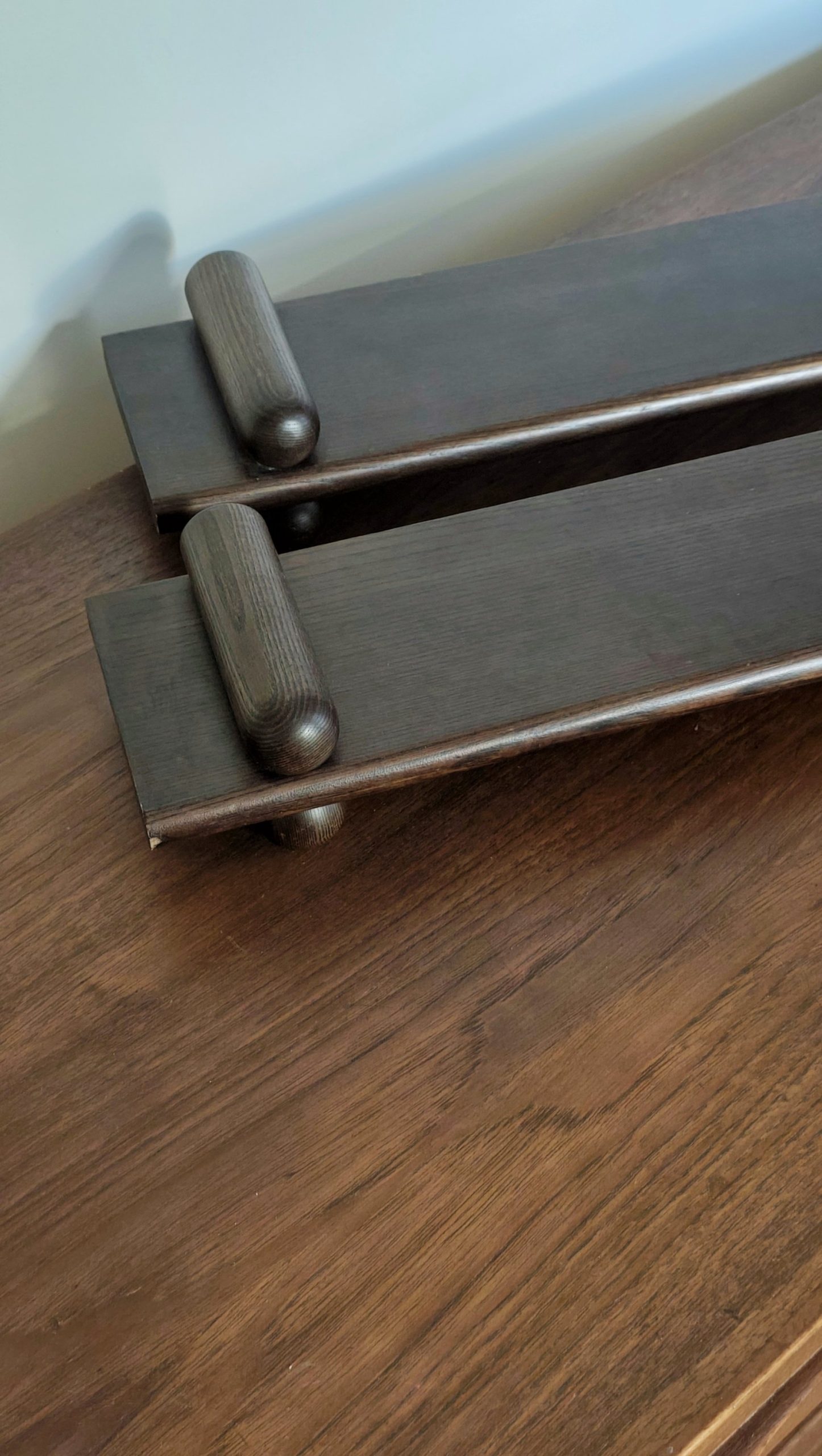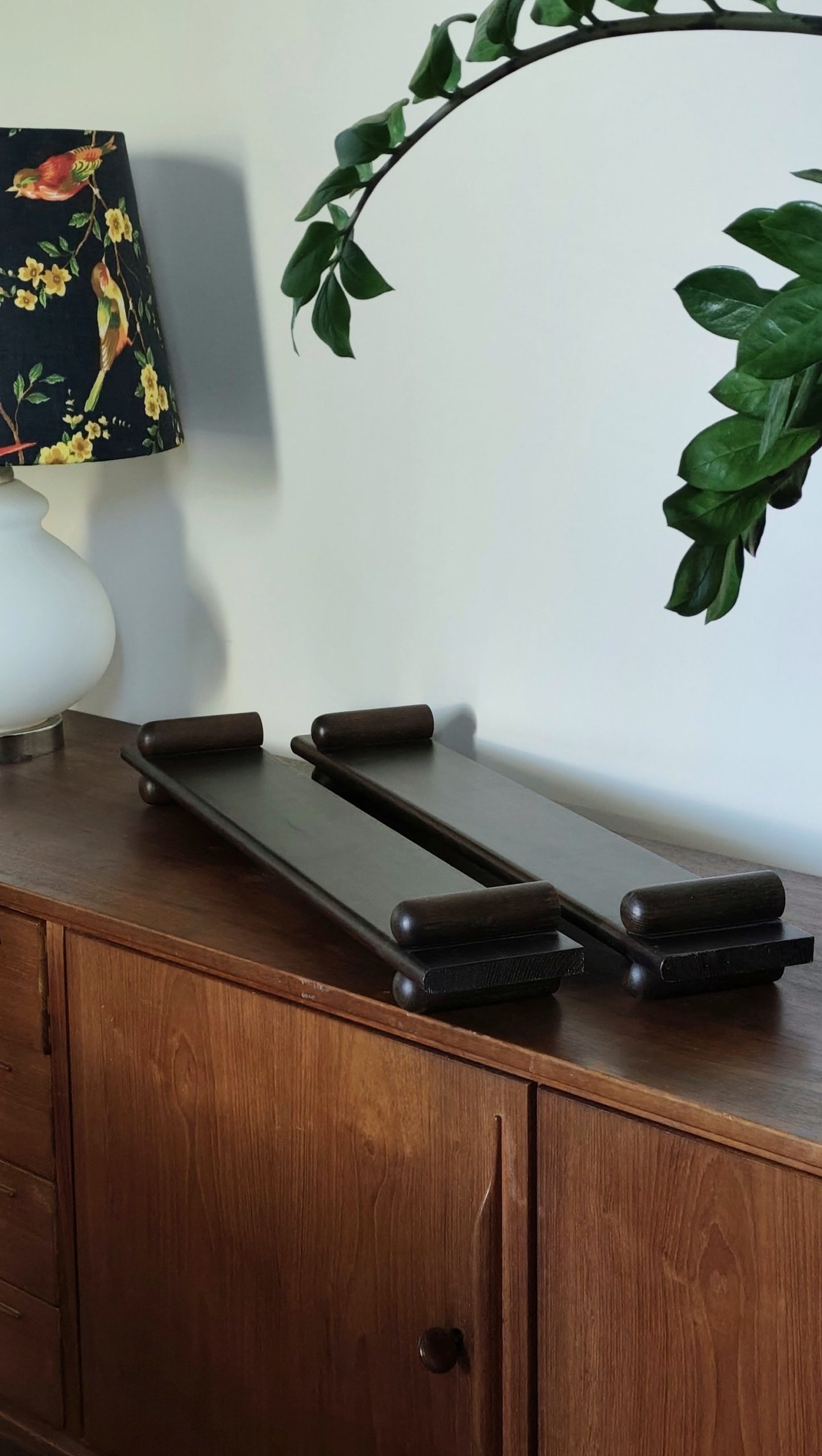 Ces pièces sont en chêne massif teinté foncé et présentent un design épuré et organique, caractéristique des productions italiennes des années 1960. Elles rappellent le mobilier minimaliste et modulaire de designers de cette époque.