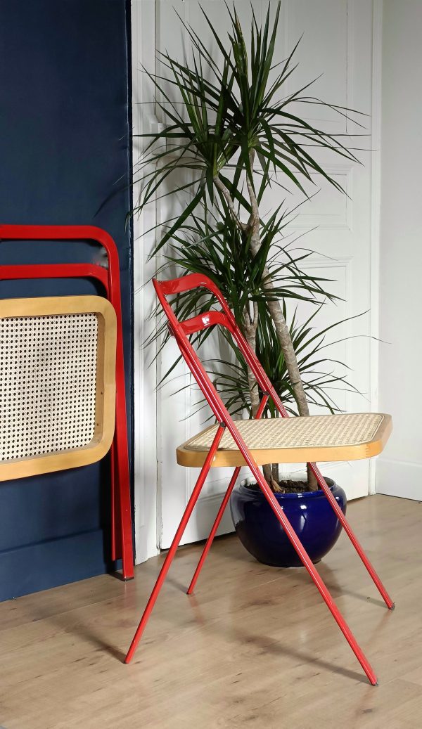 En acier laqué de couleur rouge avec des sièges en paille de vienne.
