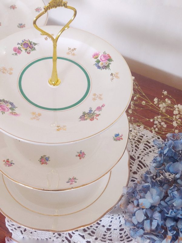 Présentoir à gâteaux aussi appelé serviteur muet, réalisé par mes soins à partir d’assiettes anciennes chinées minutieusement assorties.