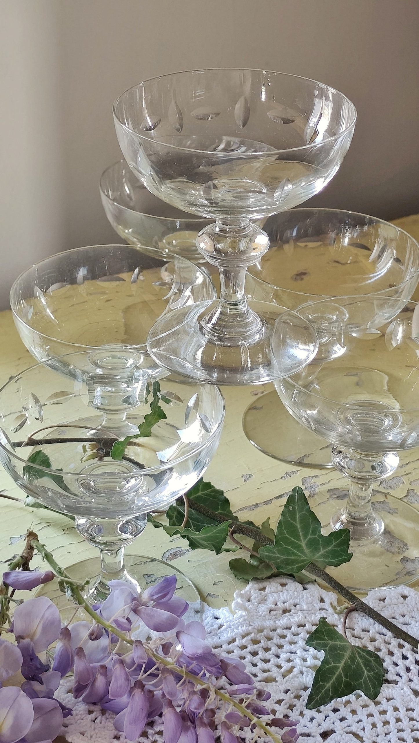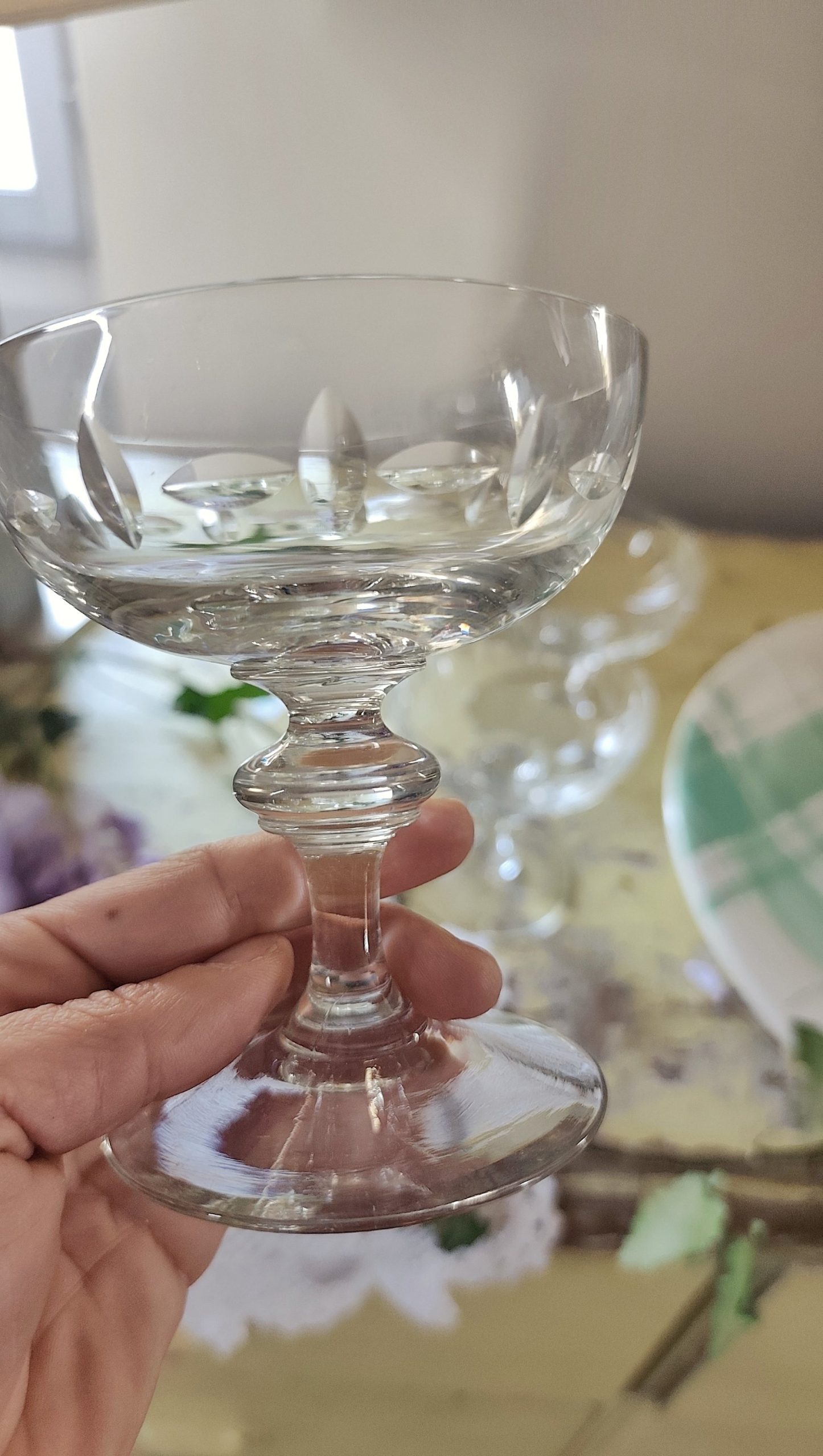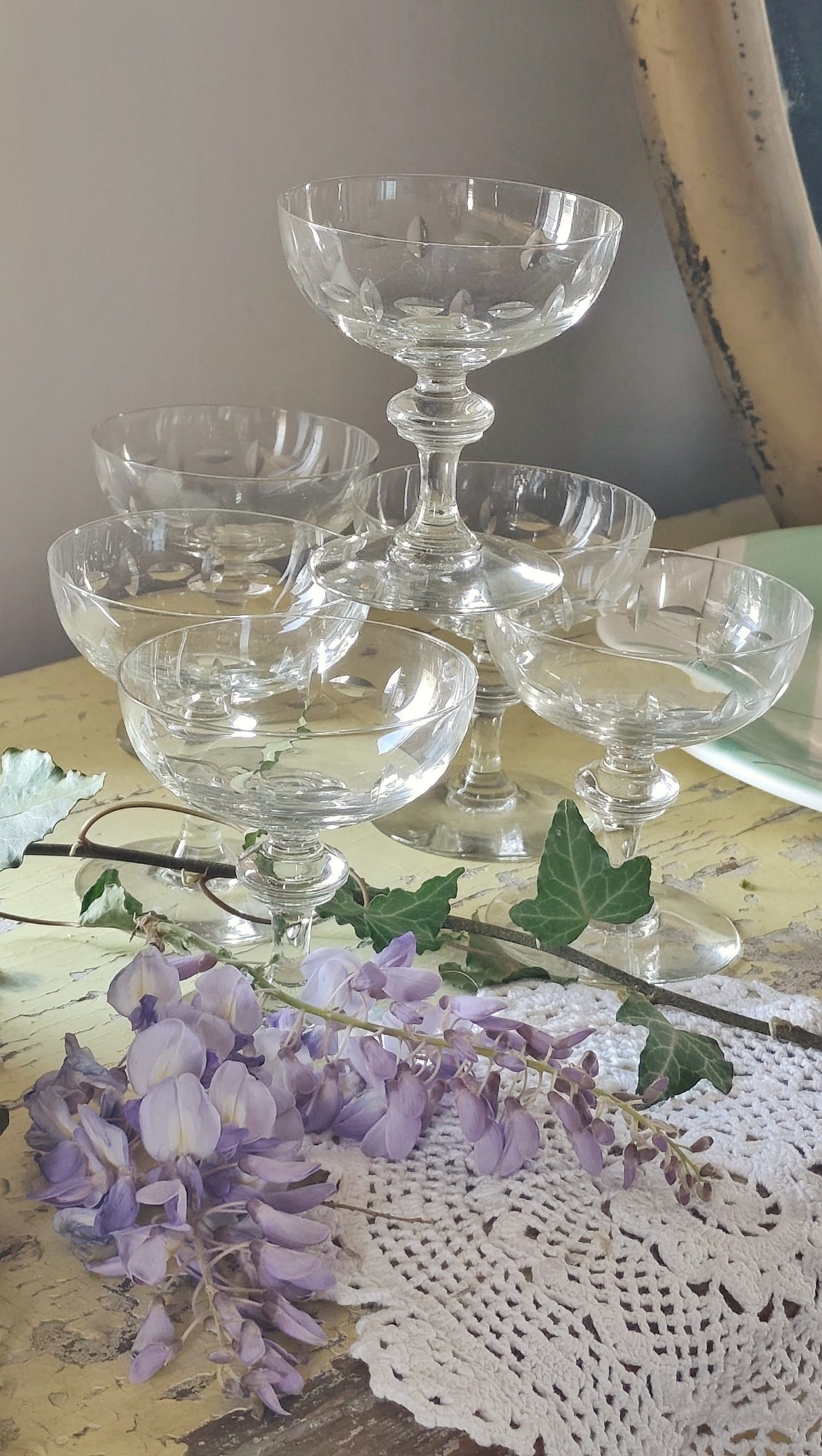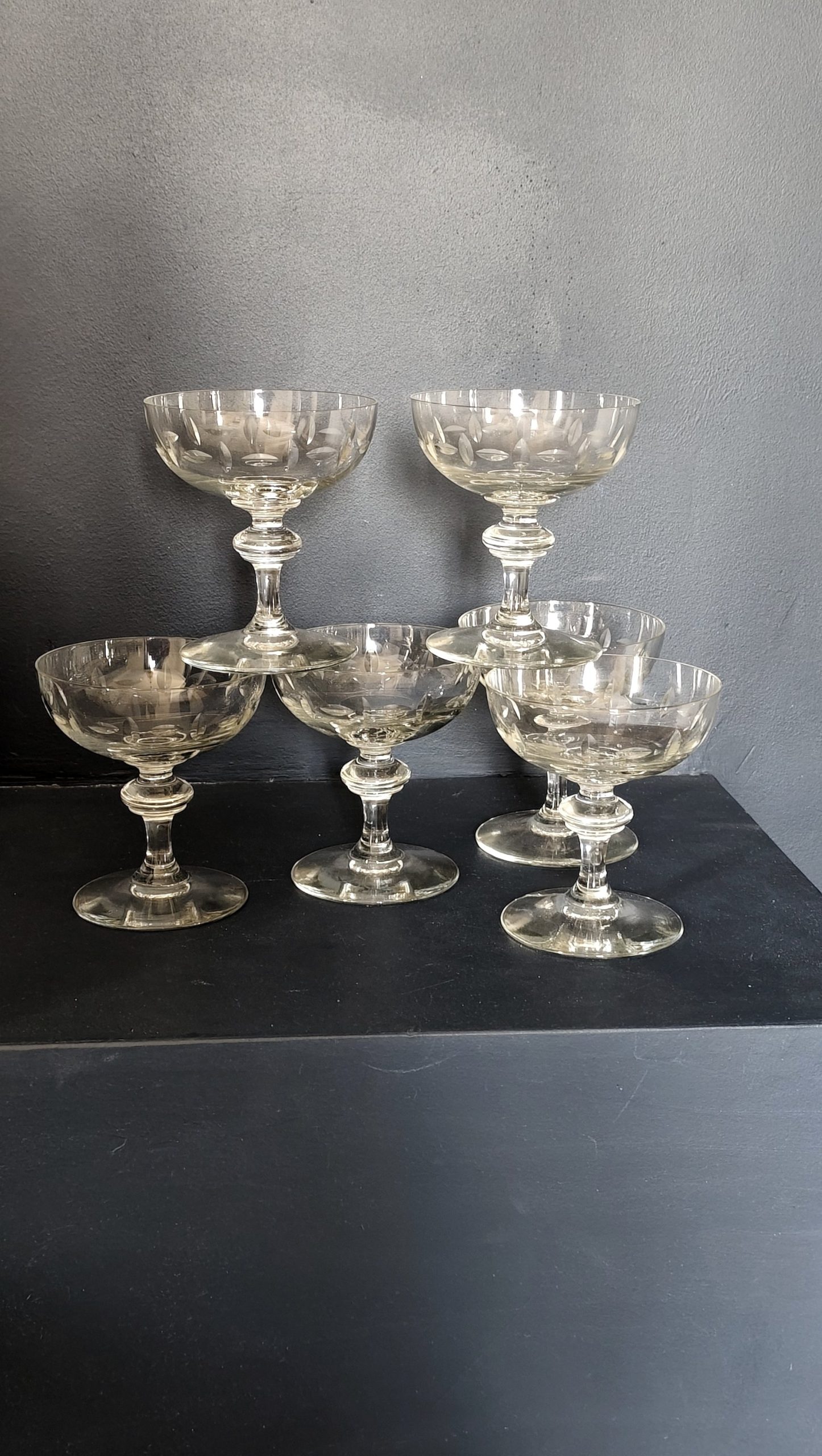 Série de 6 coupes à champagne anciennes en cristal taillé. Regardez-les en détails, elles sont pleines de charme.