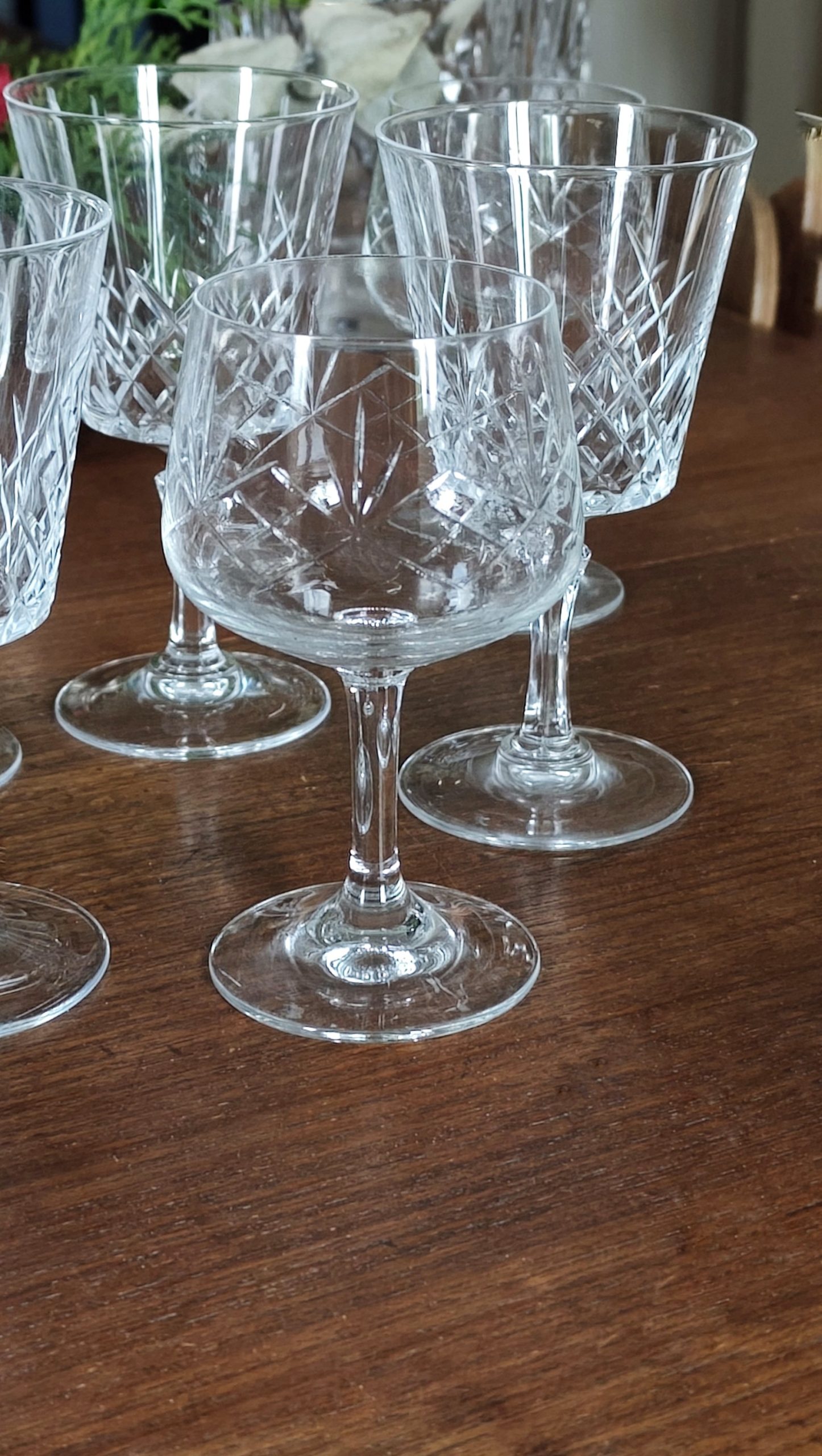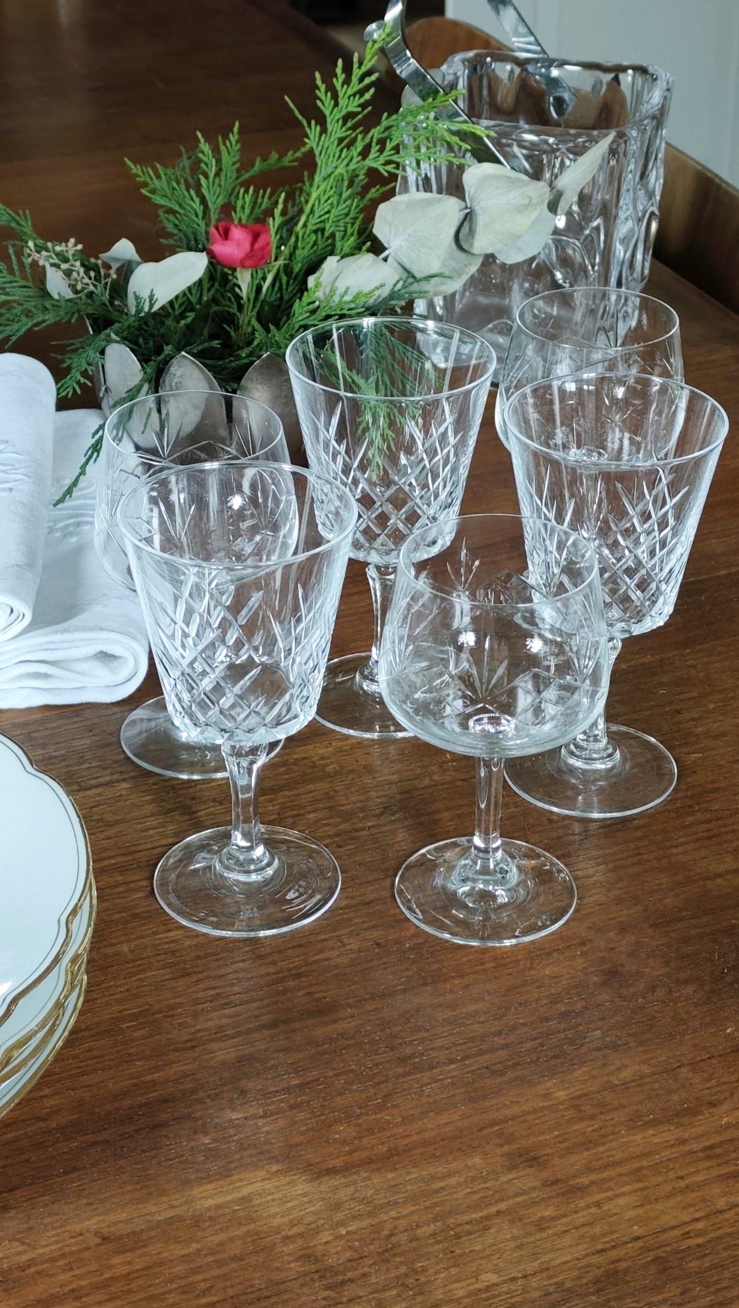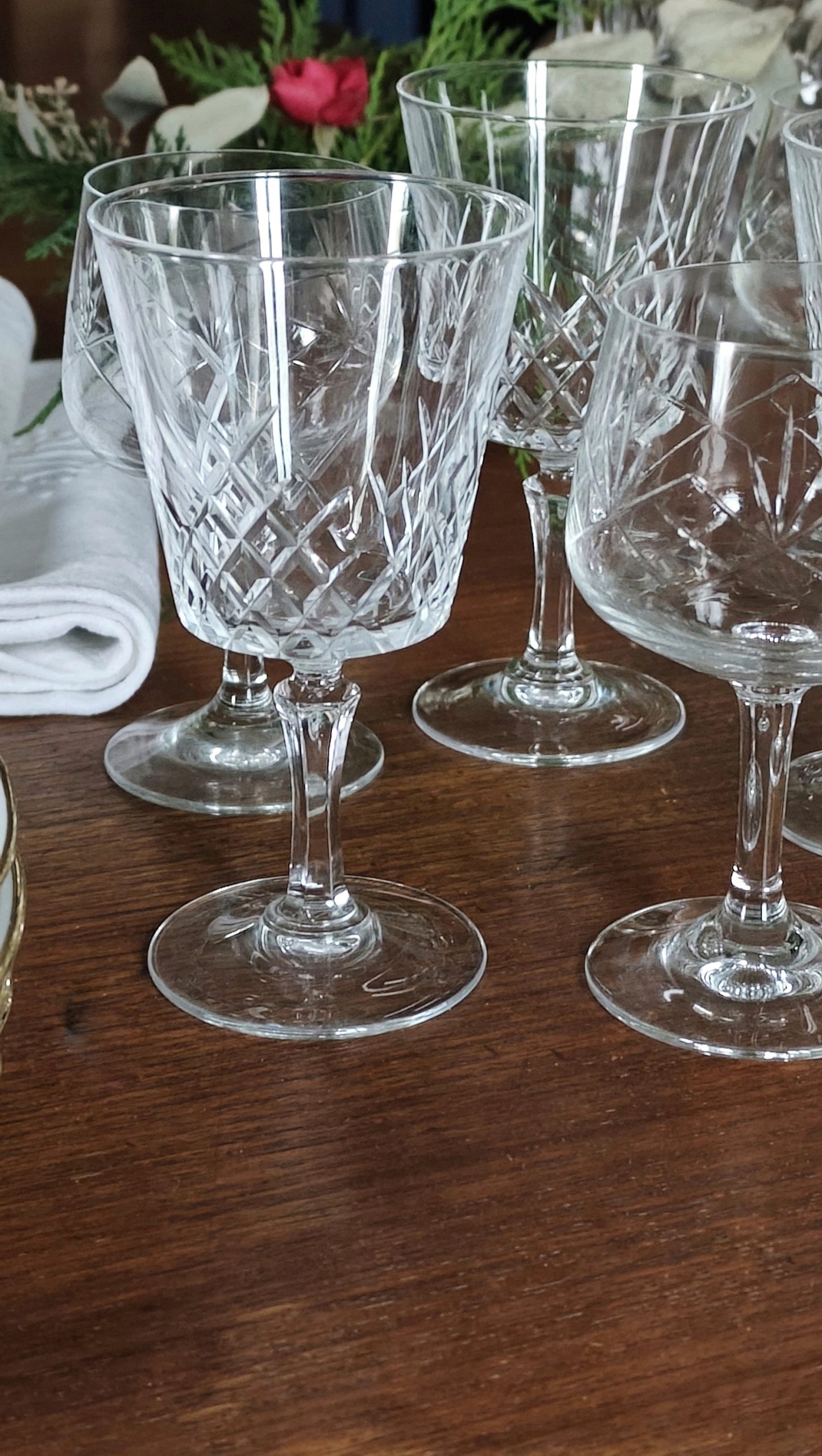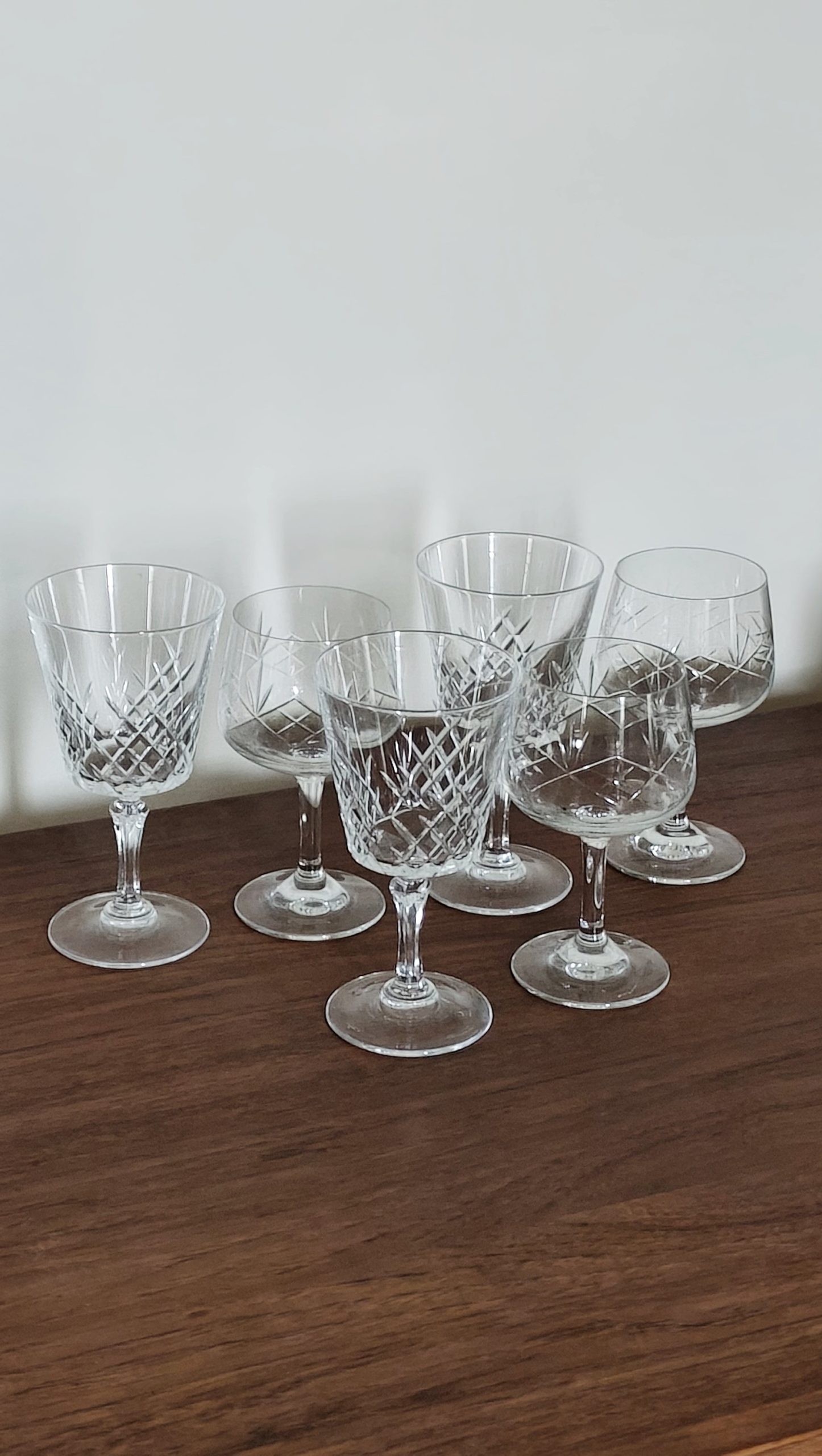 Ici : un service de 5 verres. Deux modèles en cristal taillés minutieusement associés (3 verres de chaque modèle) pour accompagner vos mets.