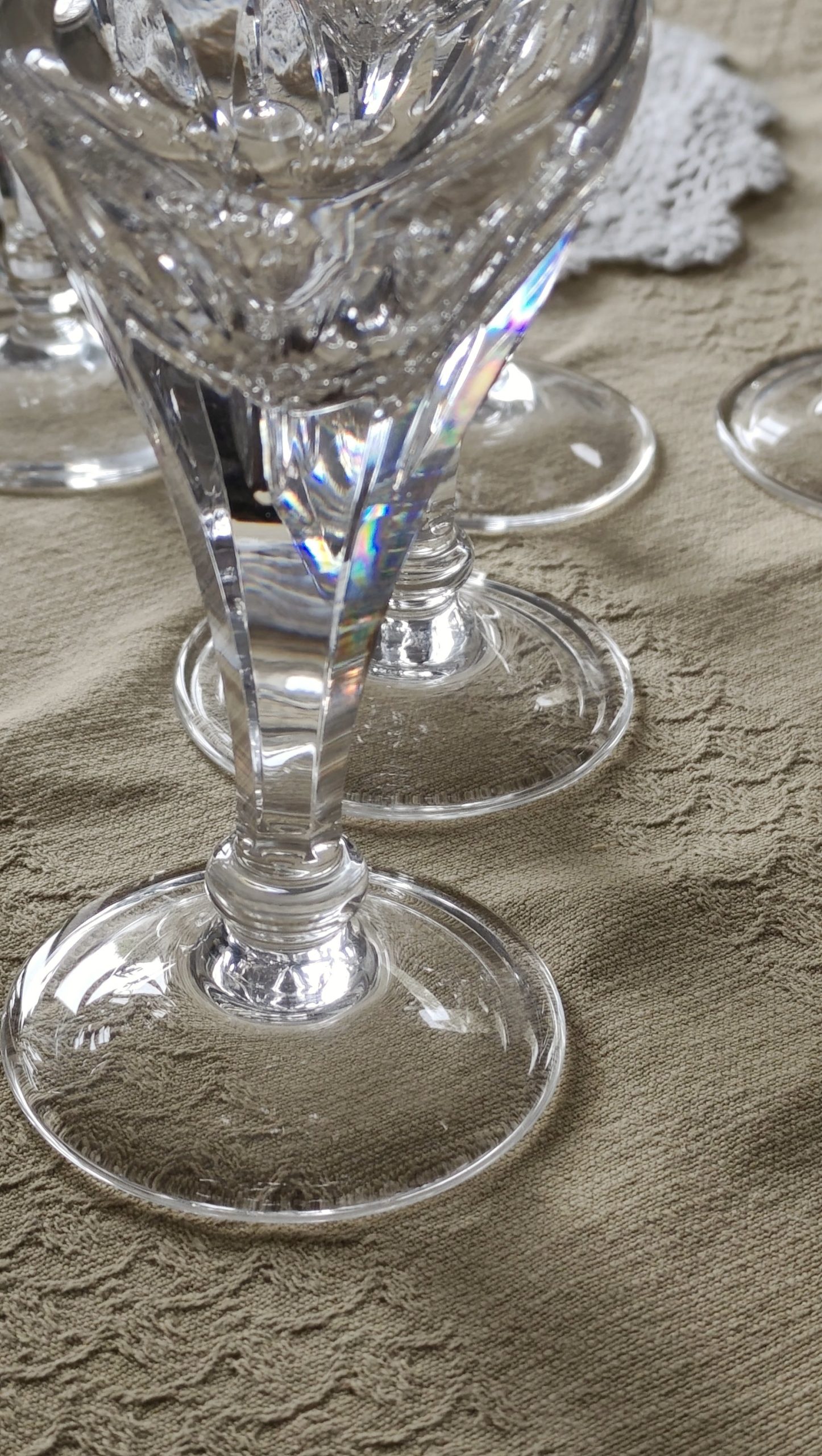 Un service de 6 pièces, toutes en excellent état. Aucune brèche, cristal parfaitement clair.
