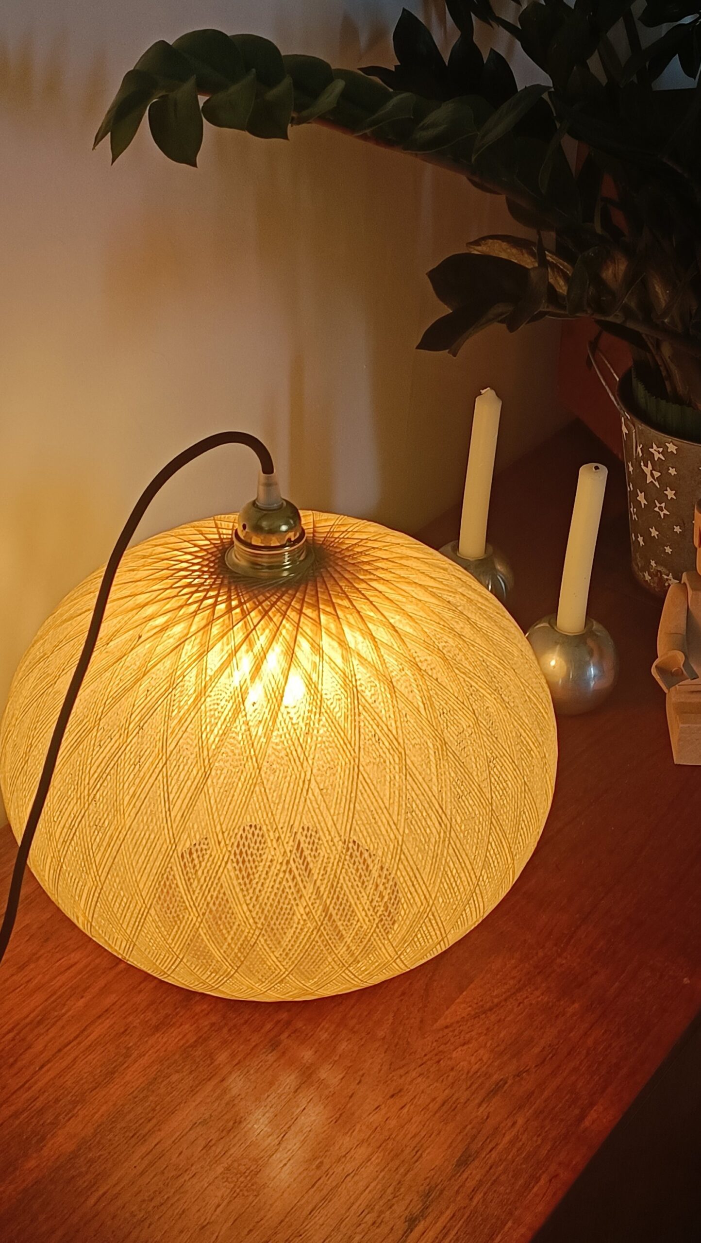 Diam globe : 31 cm / H totale maxi avec fil : 130 cm – À noter que l’on peut bien-sûr raccourcir le fil à guise