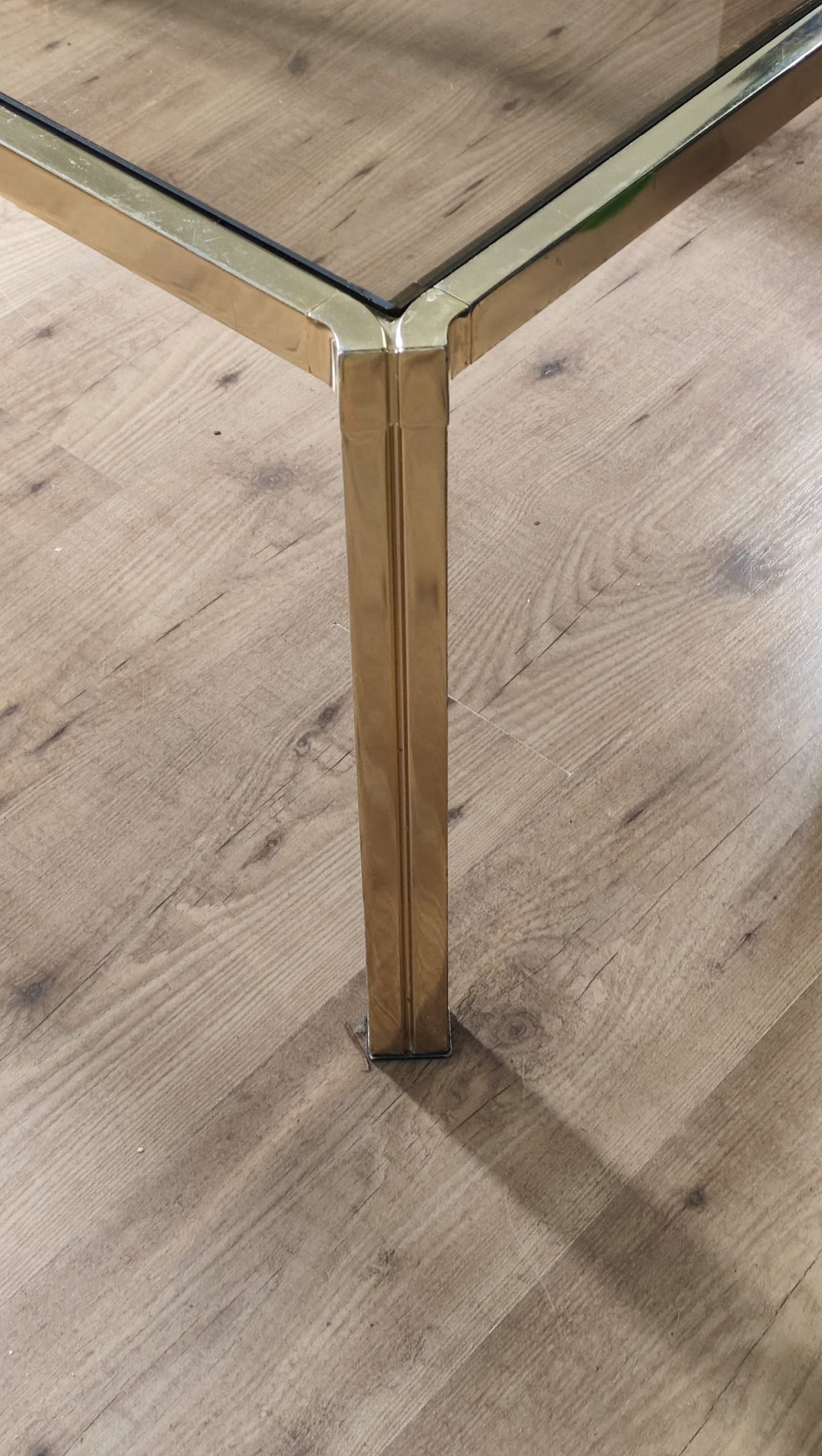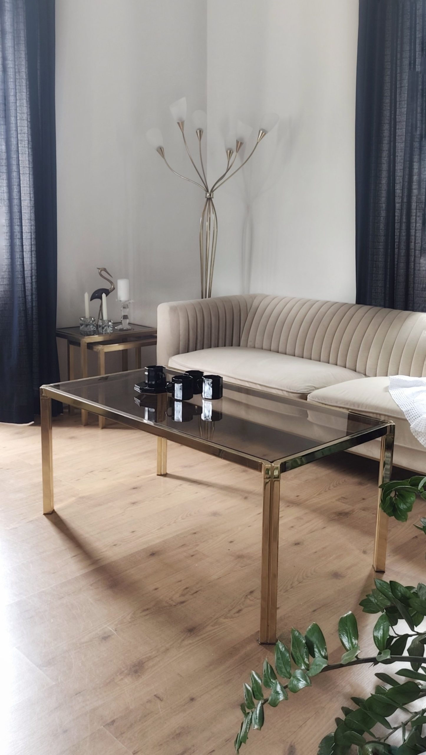 Jolie et très chic table basse, avec sa structure laiton travaillée en toute sobriété et son grand plateau en verre fumé.
