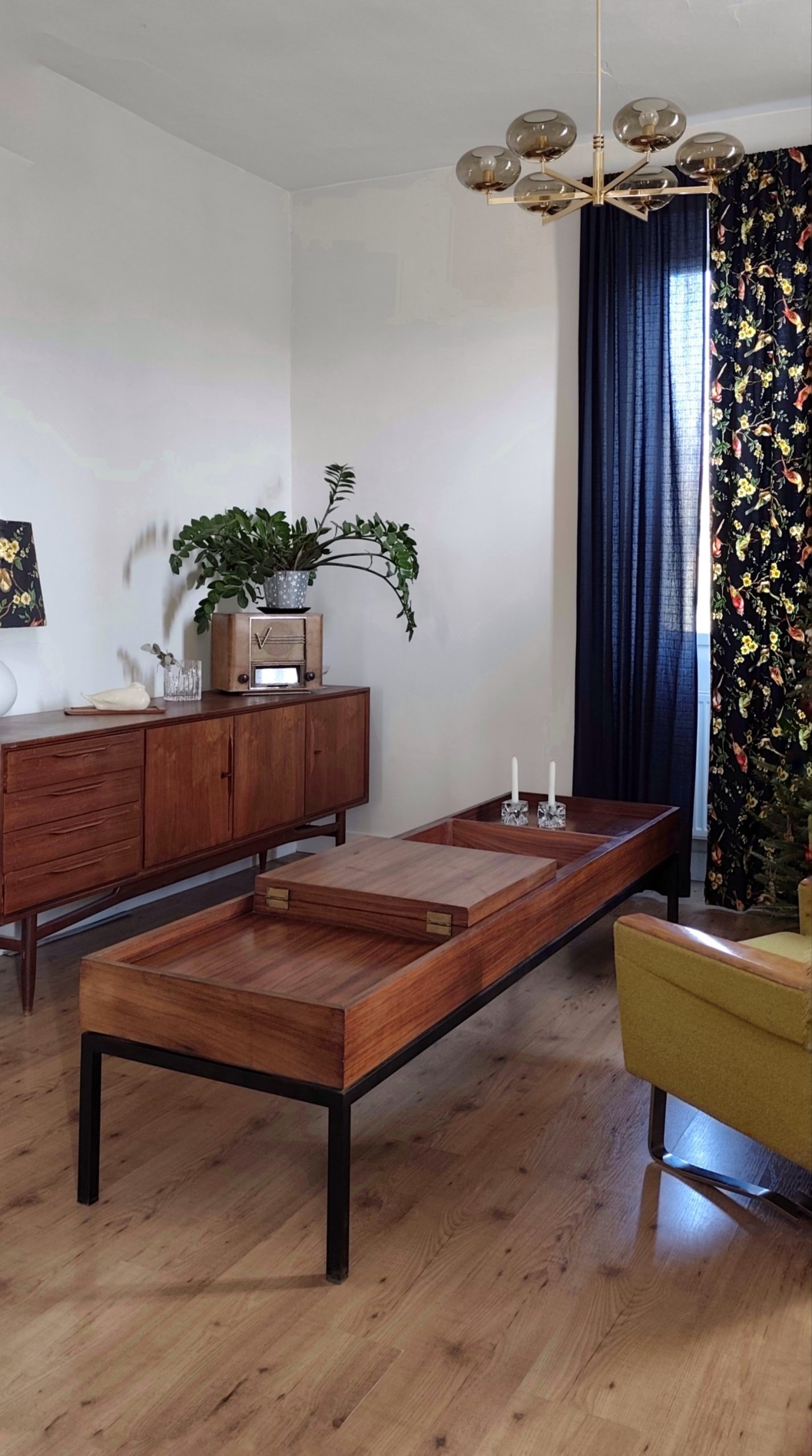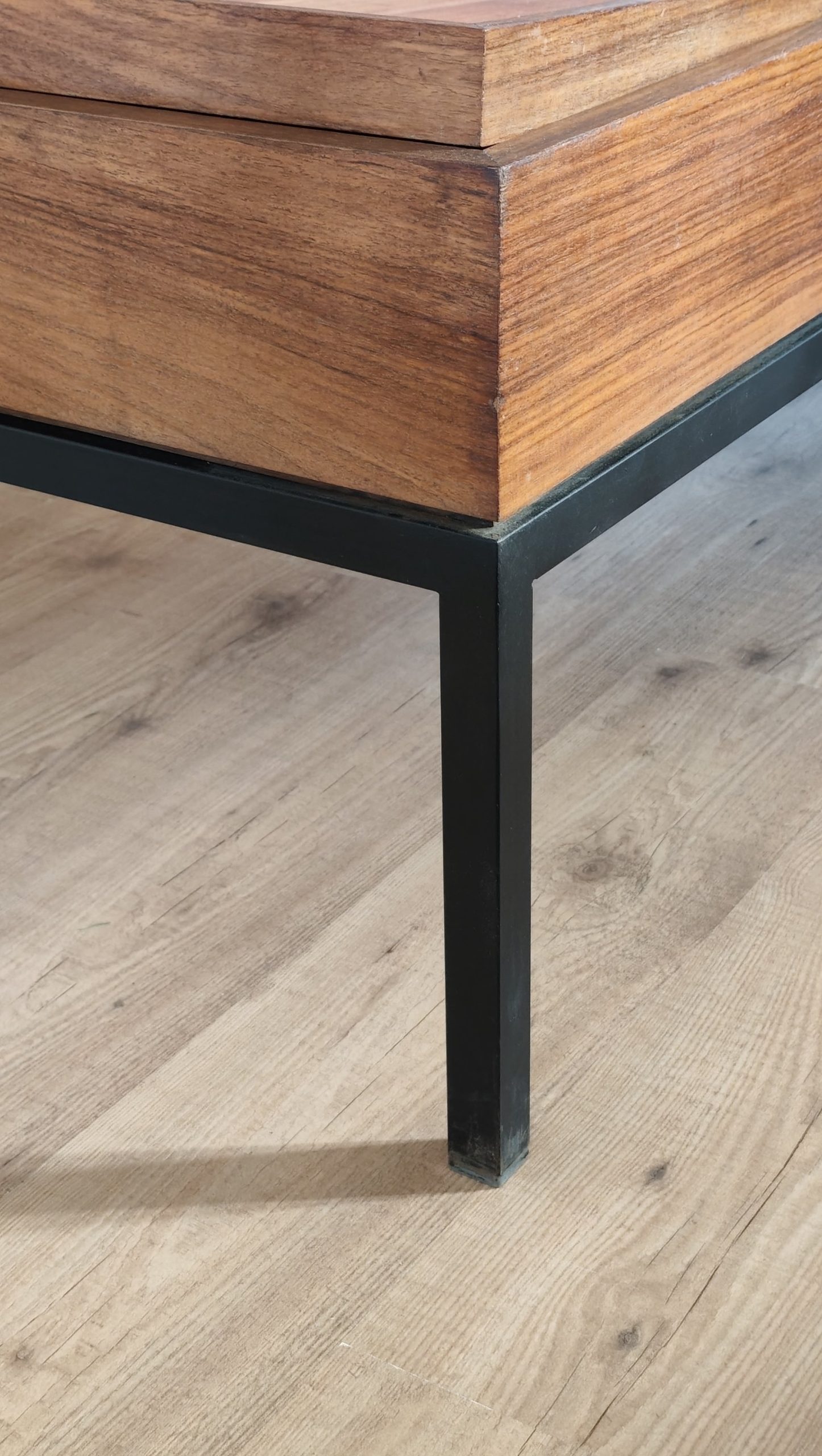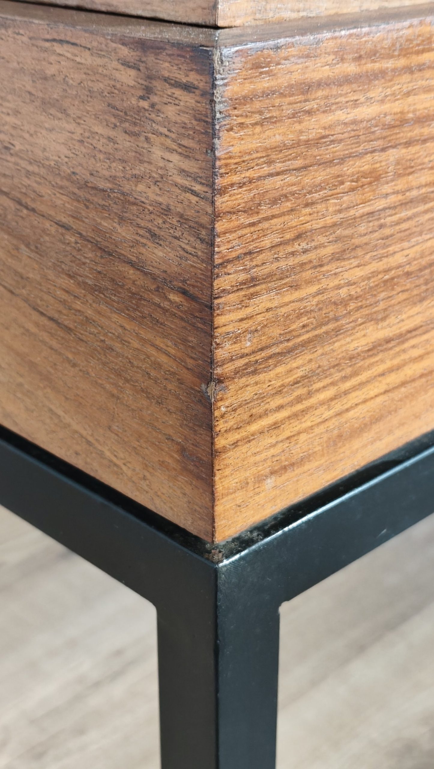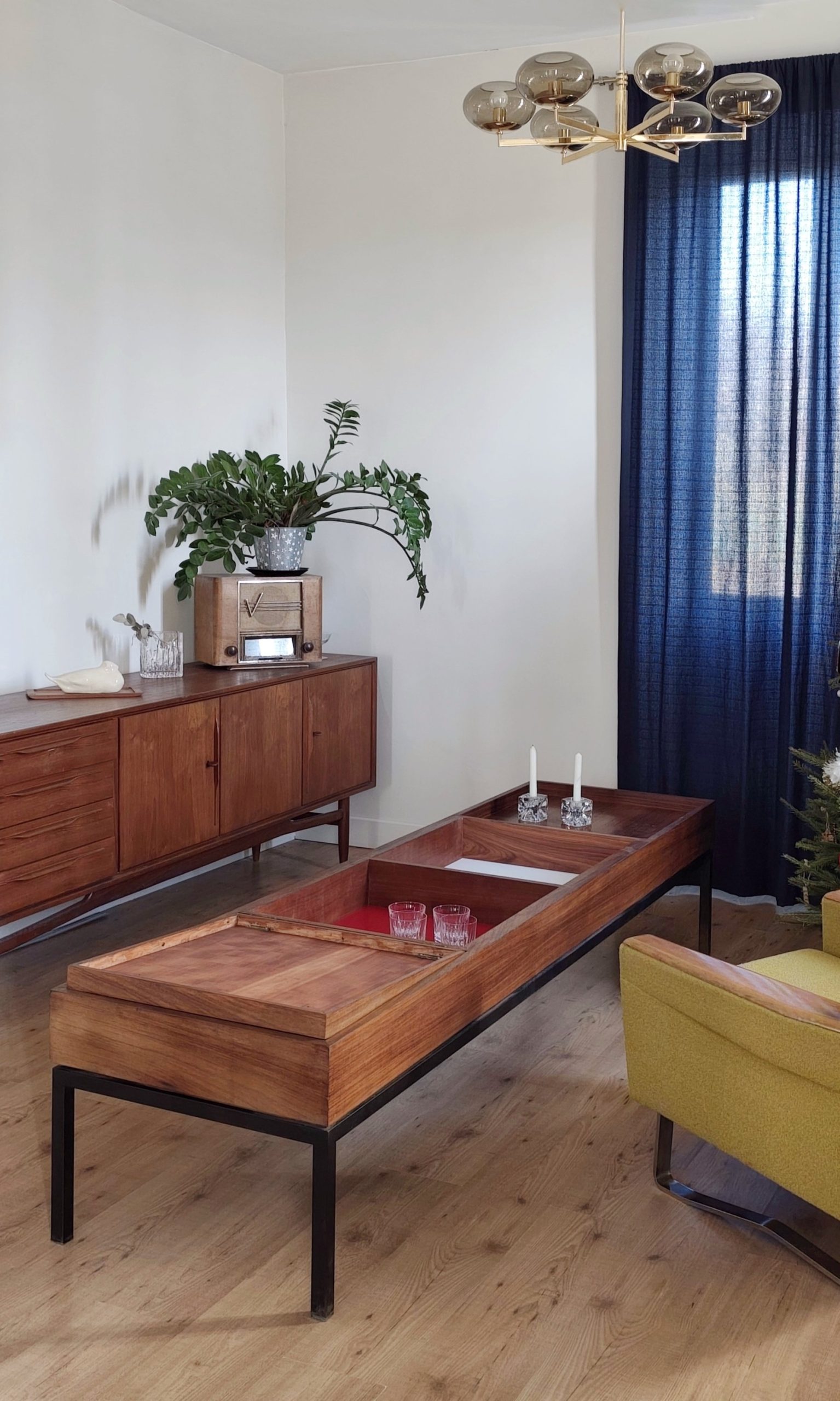 Pièce unique et d’exception. Cette table arrive tout droit de l’est de la France, c’était une commande spéciale réalisée sur-mesure pour les ateliers Villeroy et Boch de Moselle dans les années 60. Cette table de métier était notamment utilisée pour fabriquer des plaques de carrelage. Elle allie ainsi héritage industriel, design radical et en la chinant, je me suis tout de suite projetée.
