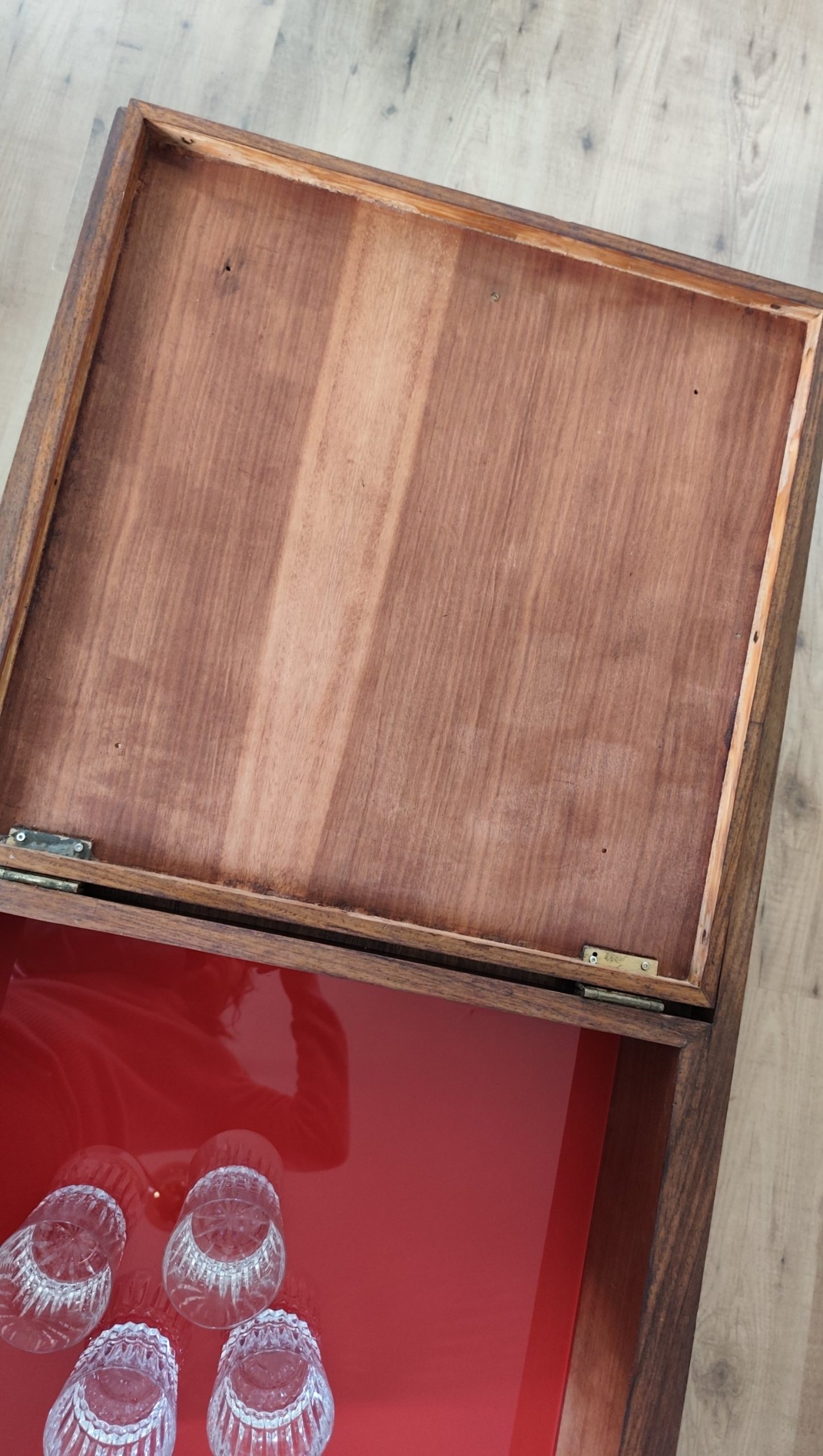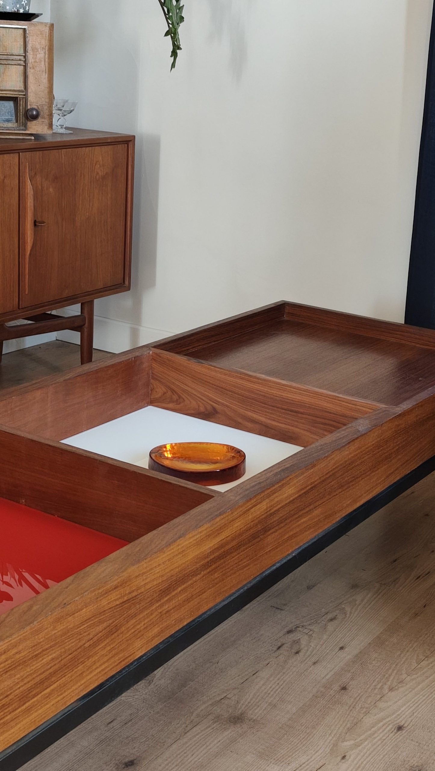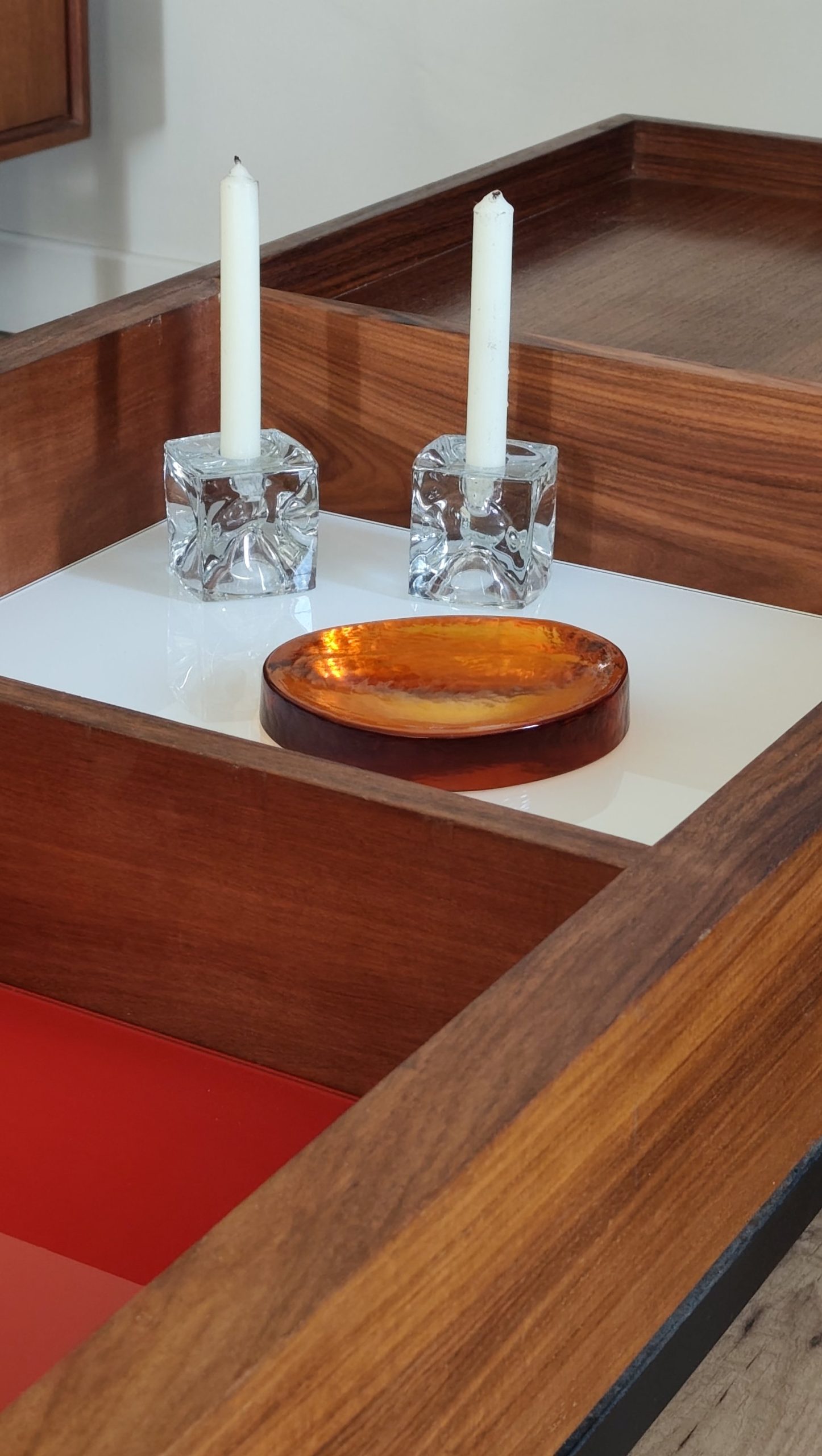 Sa structure en plaquage de palissandre et aux volumes cubiques a été réinterprétée dans un esprit « Mondrian », utilisant du verre haut de gamme pour souligner ses lignes et créer des espaces de rangement intégrés (l’un qui se ferme et pas l’autre).