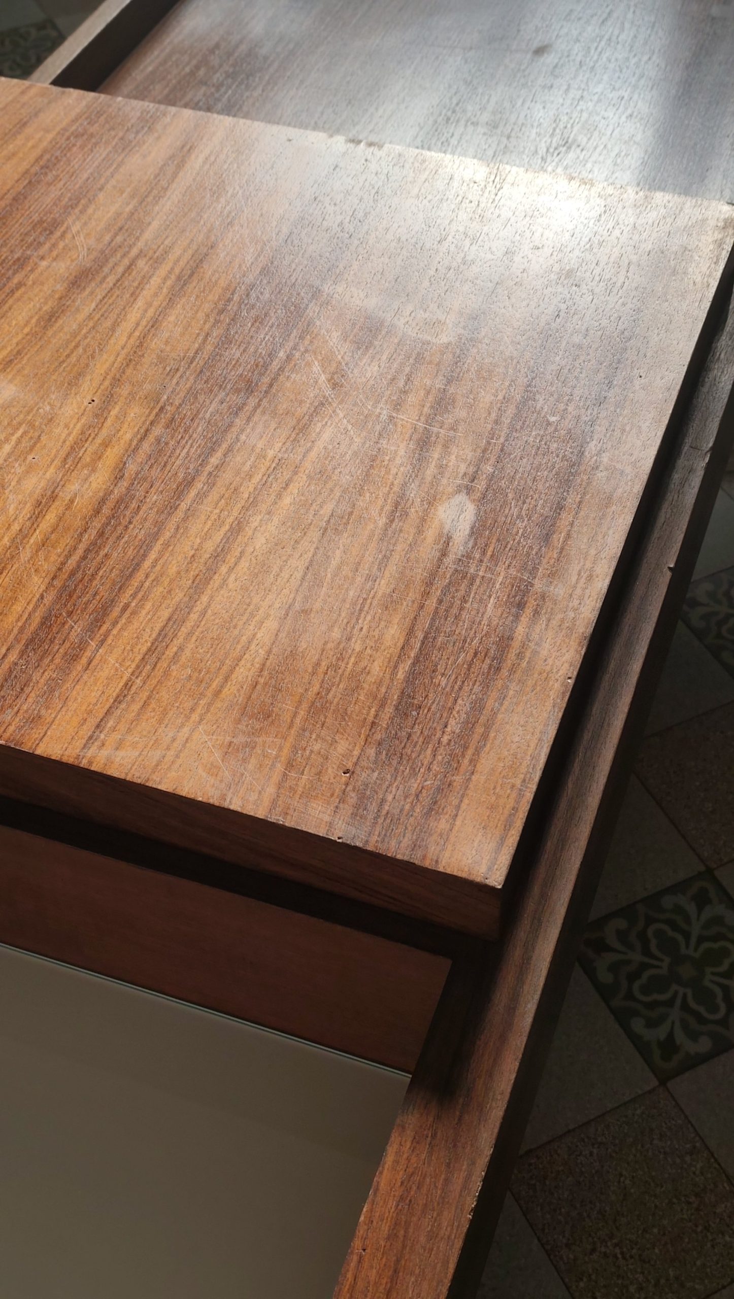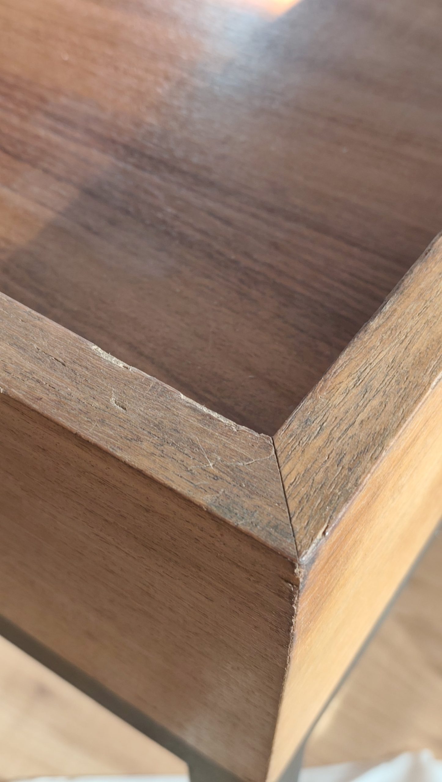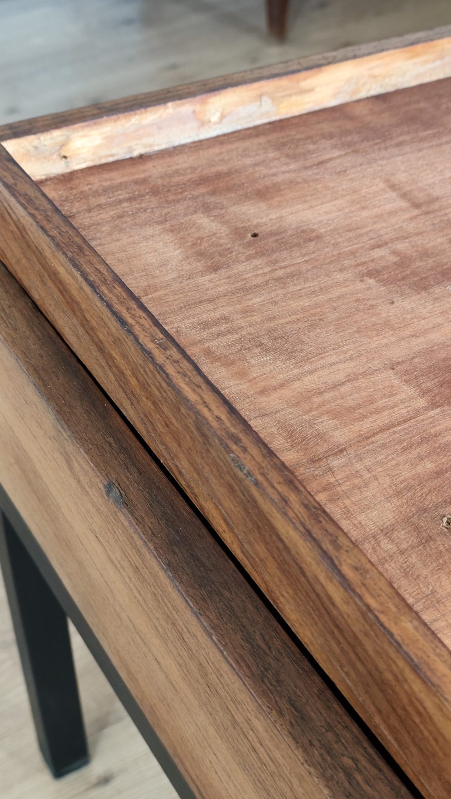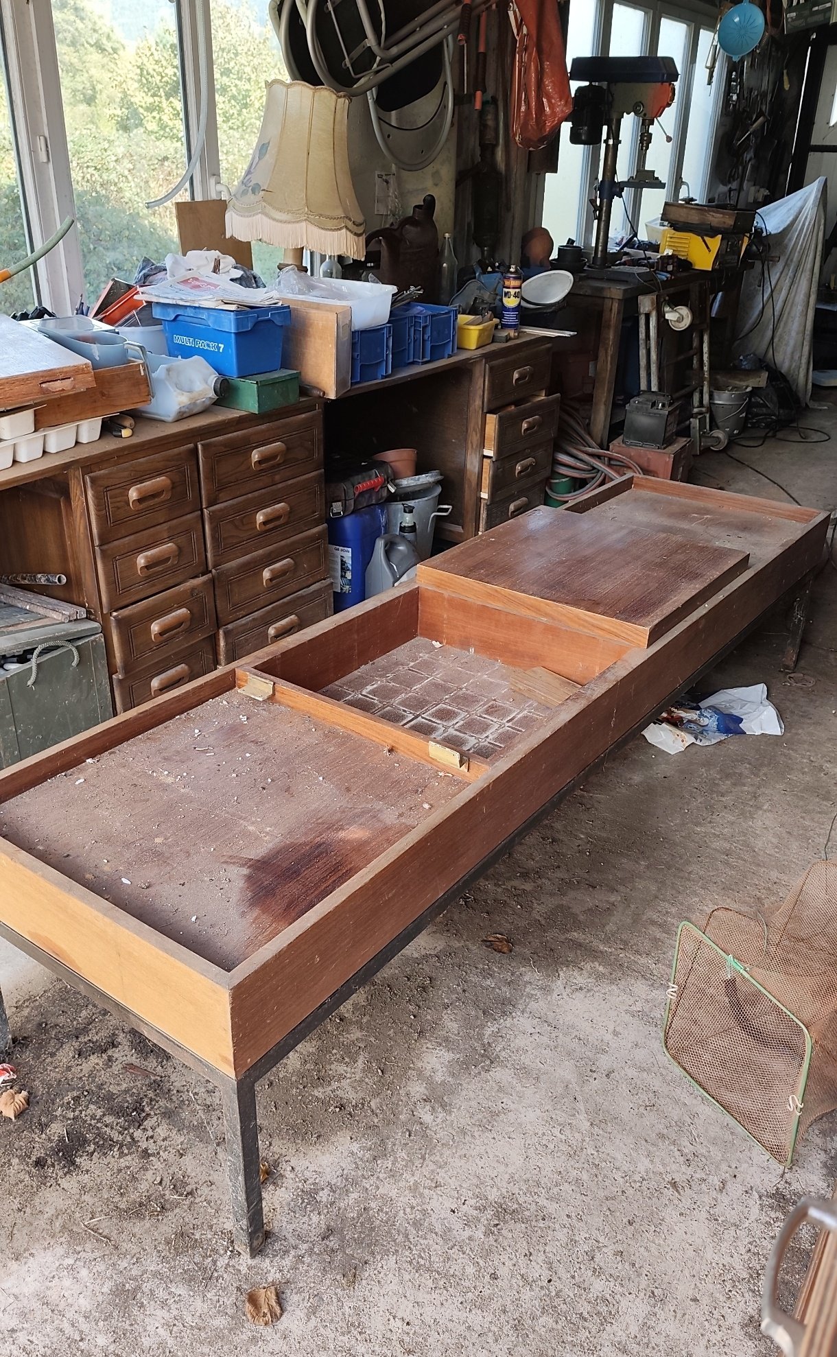 Sa restauration a été pensée pour préserver son âme : le placage conserve volontairement ses marques d’usage et sa patine d’époque, témoins de son histoire de table de métier. Cf photos.