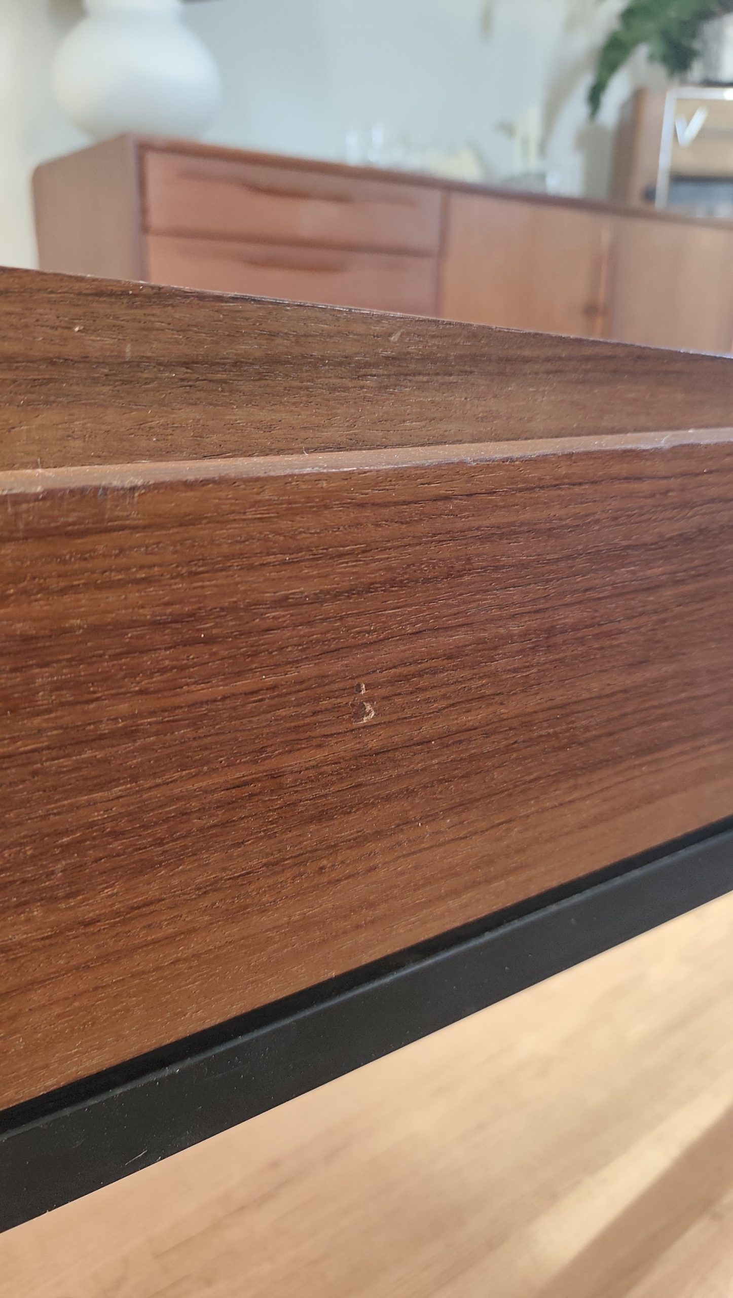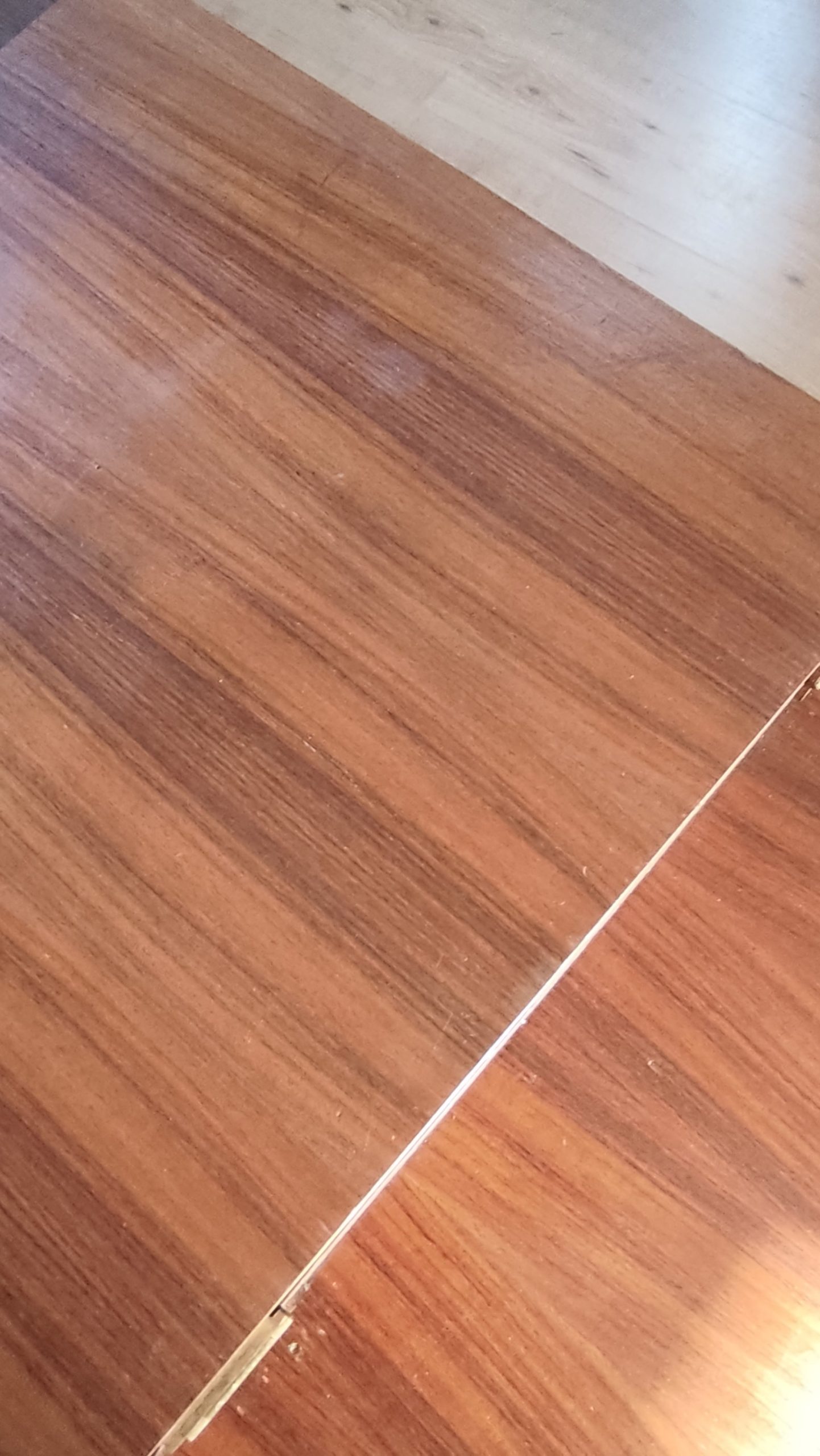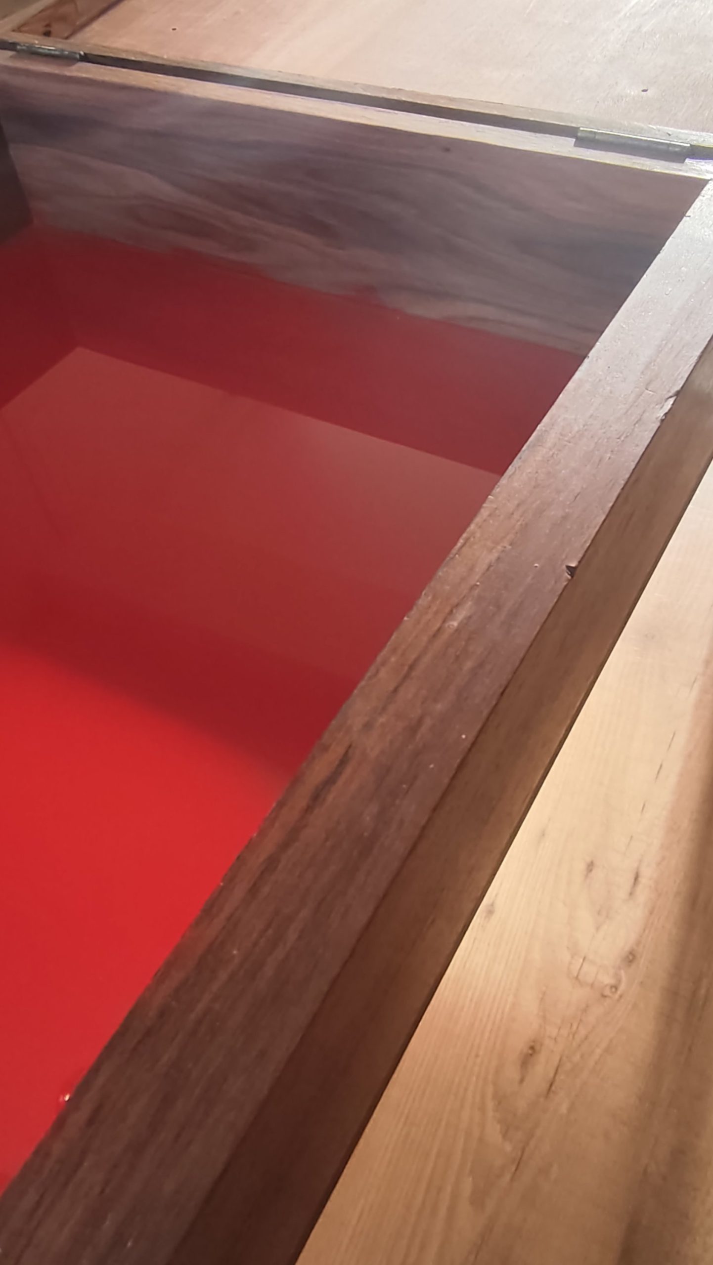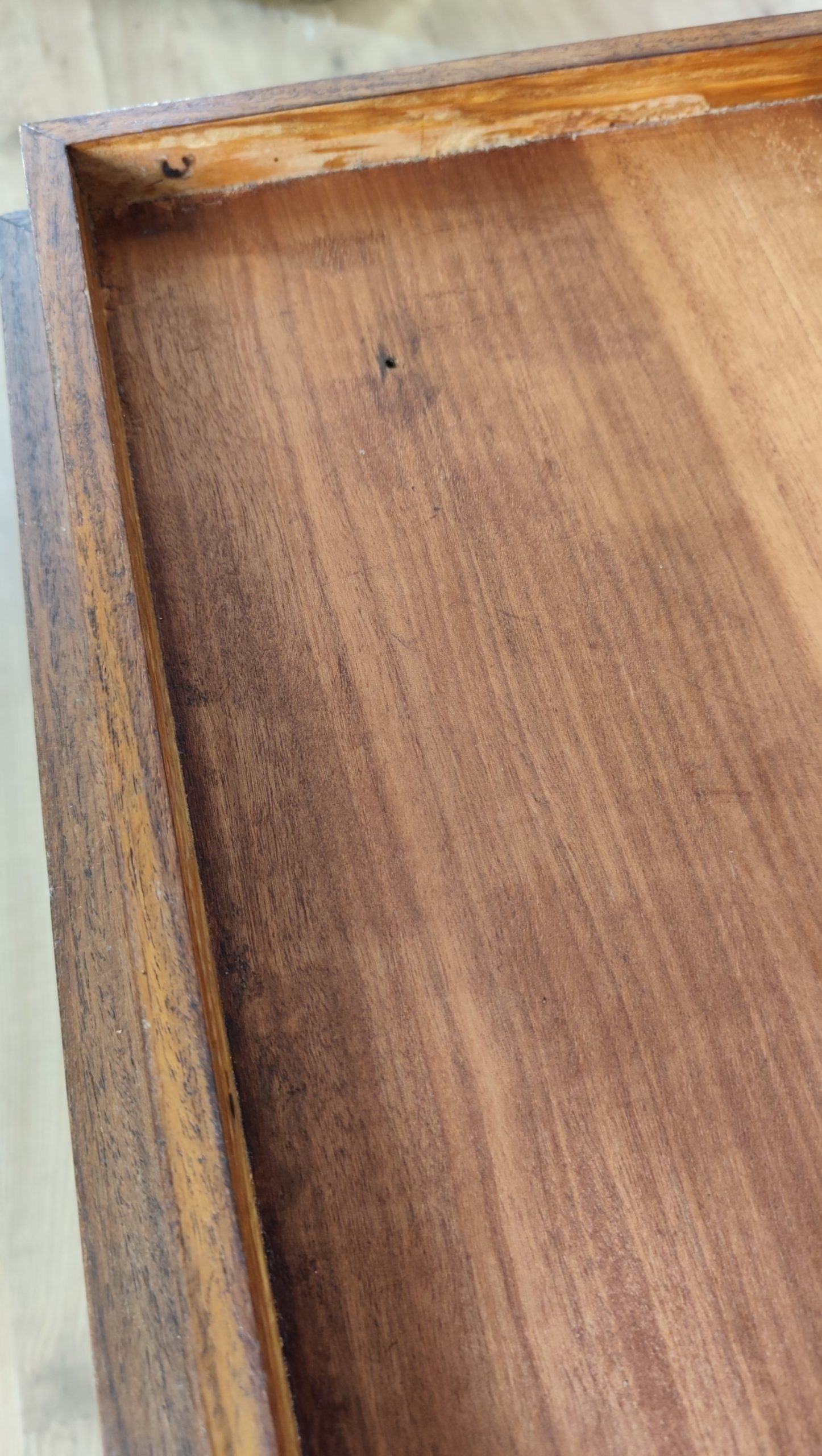Sa restauration a été pensée pour préserver son âme : le placage conserve volontairement ses marques d’usage et sa patine d’époque, témoins de son histoire de table de métier. Cf photos.