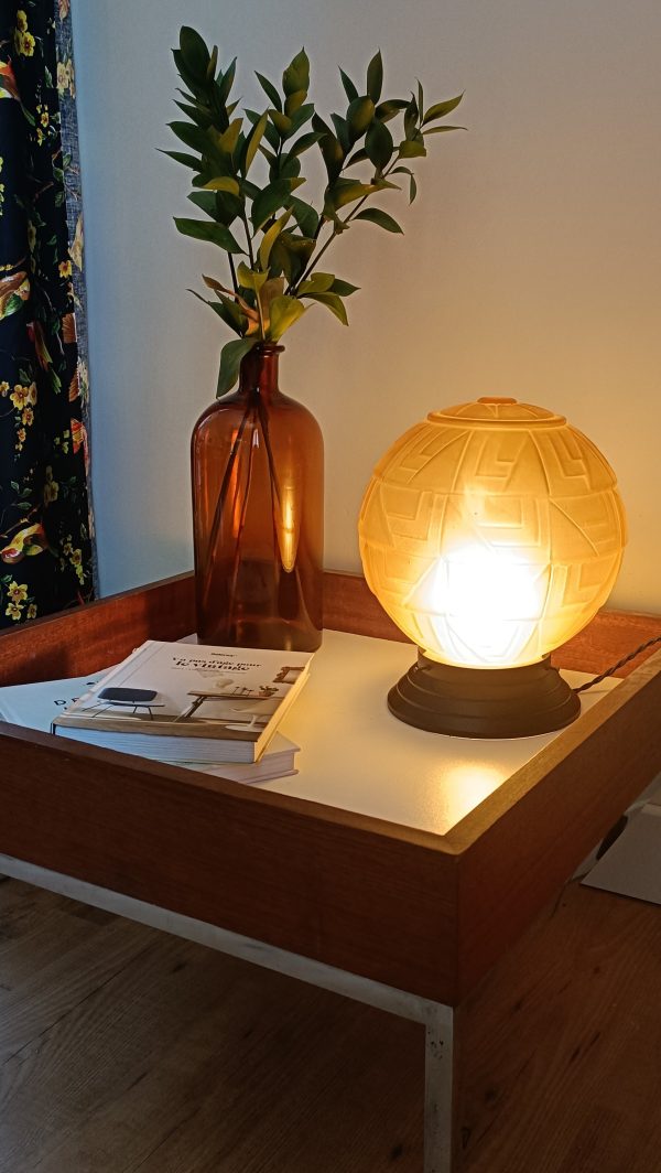 Très grand globe art déco et verre pressé moulé de couleur ambre. Monté sur support et doté d’un système électrique neuf (cordon tissu torsadé noir).