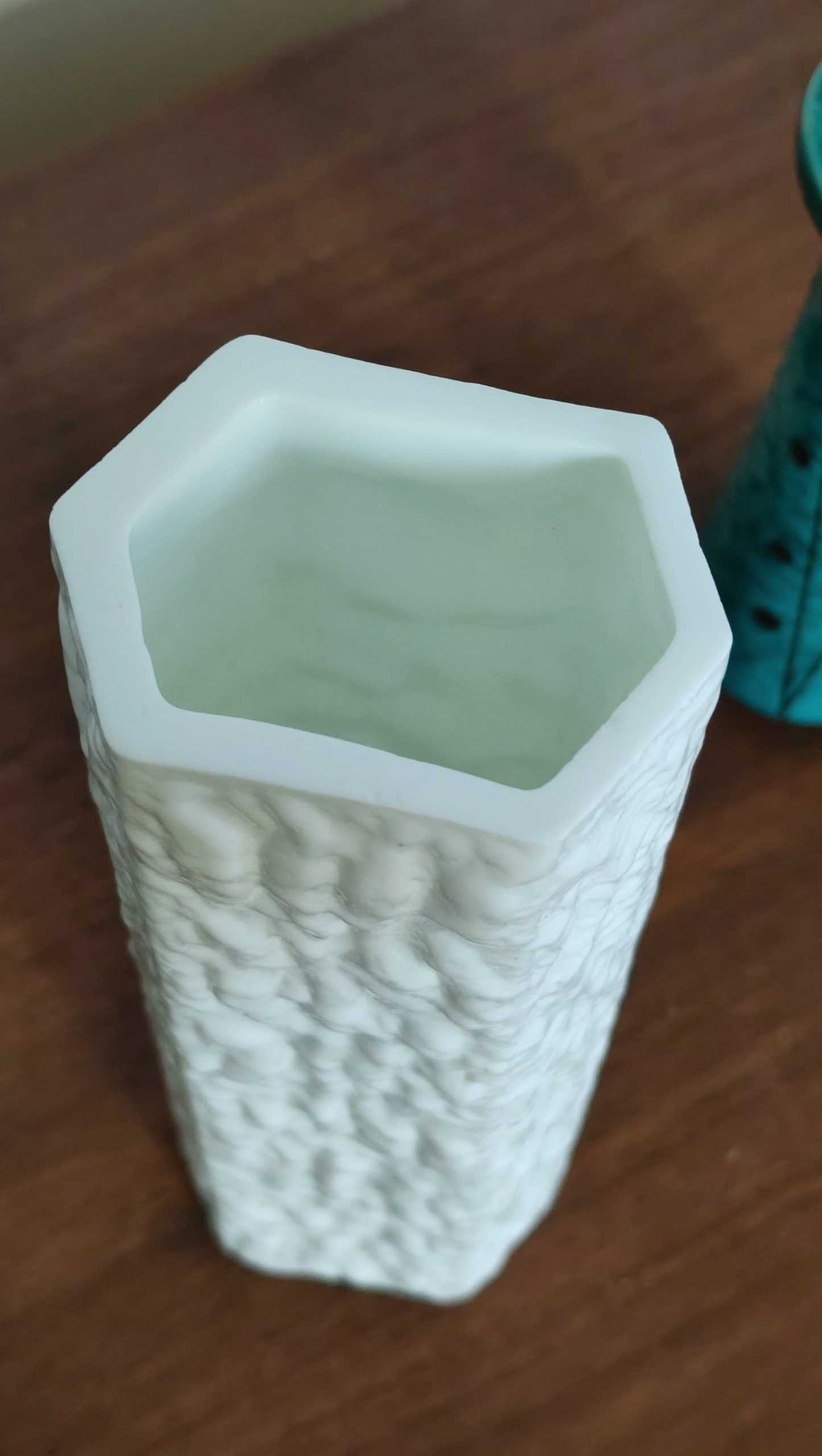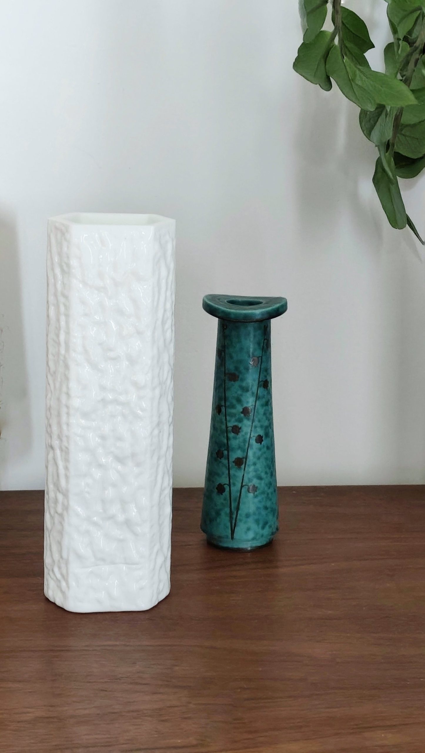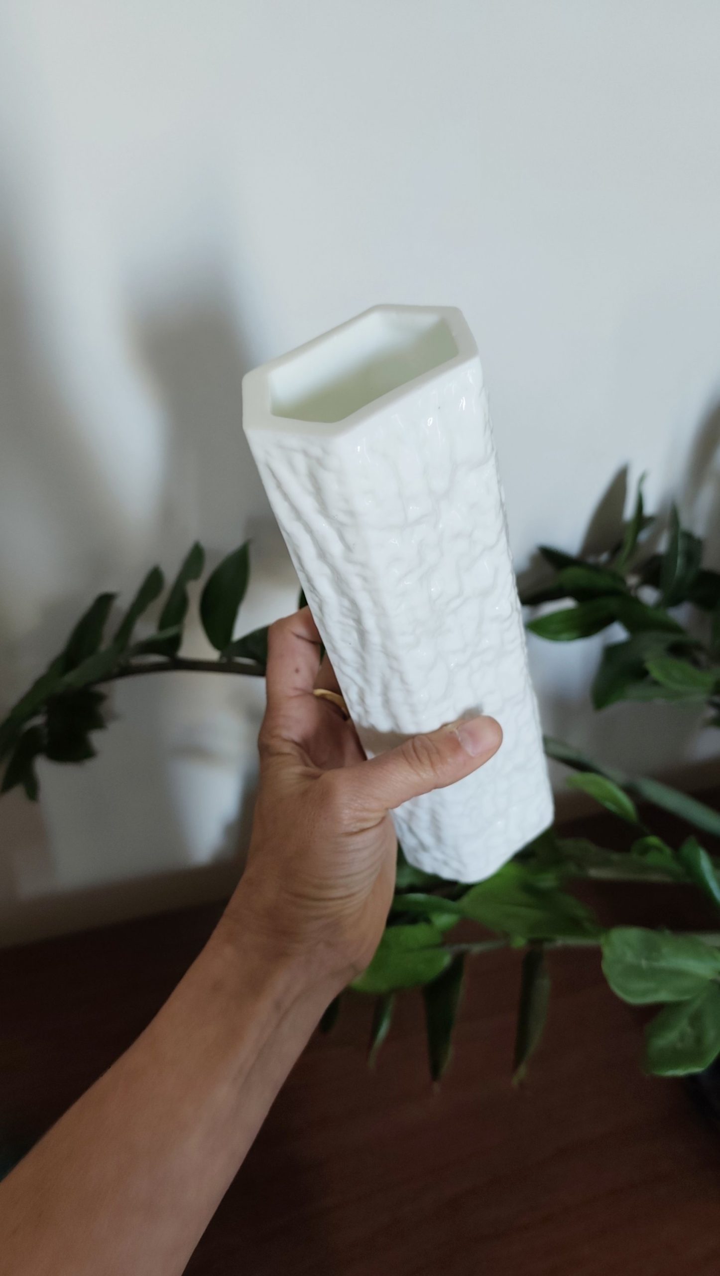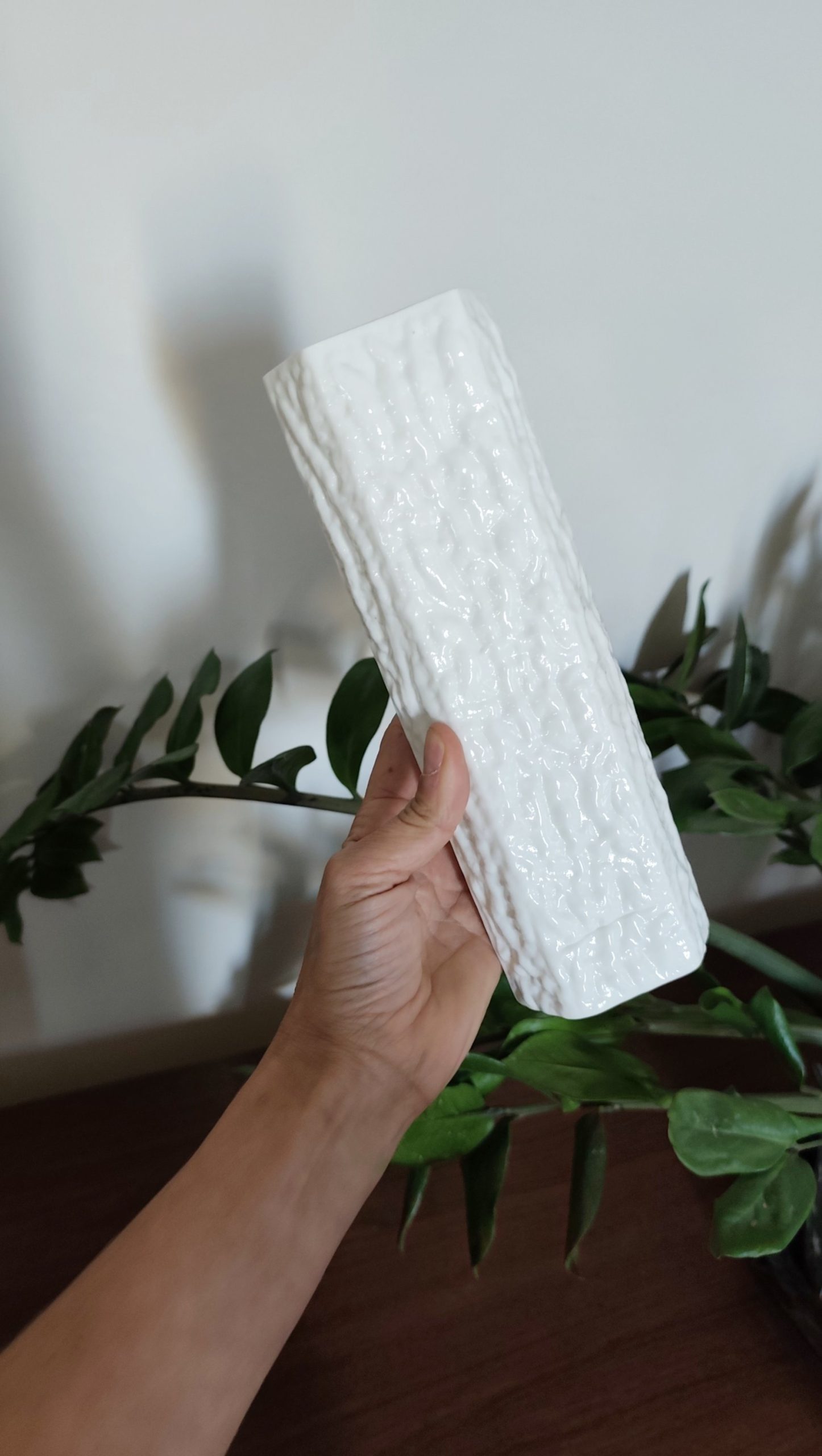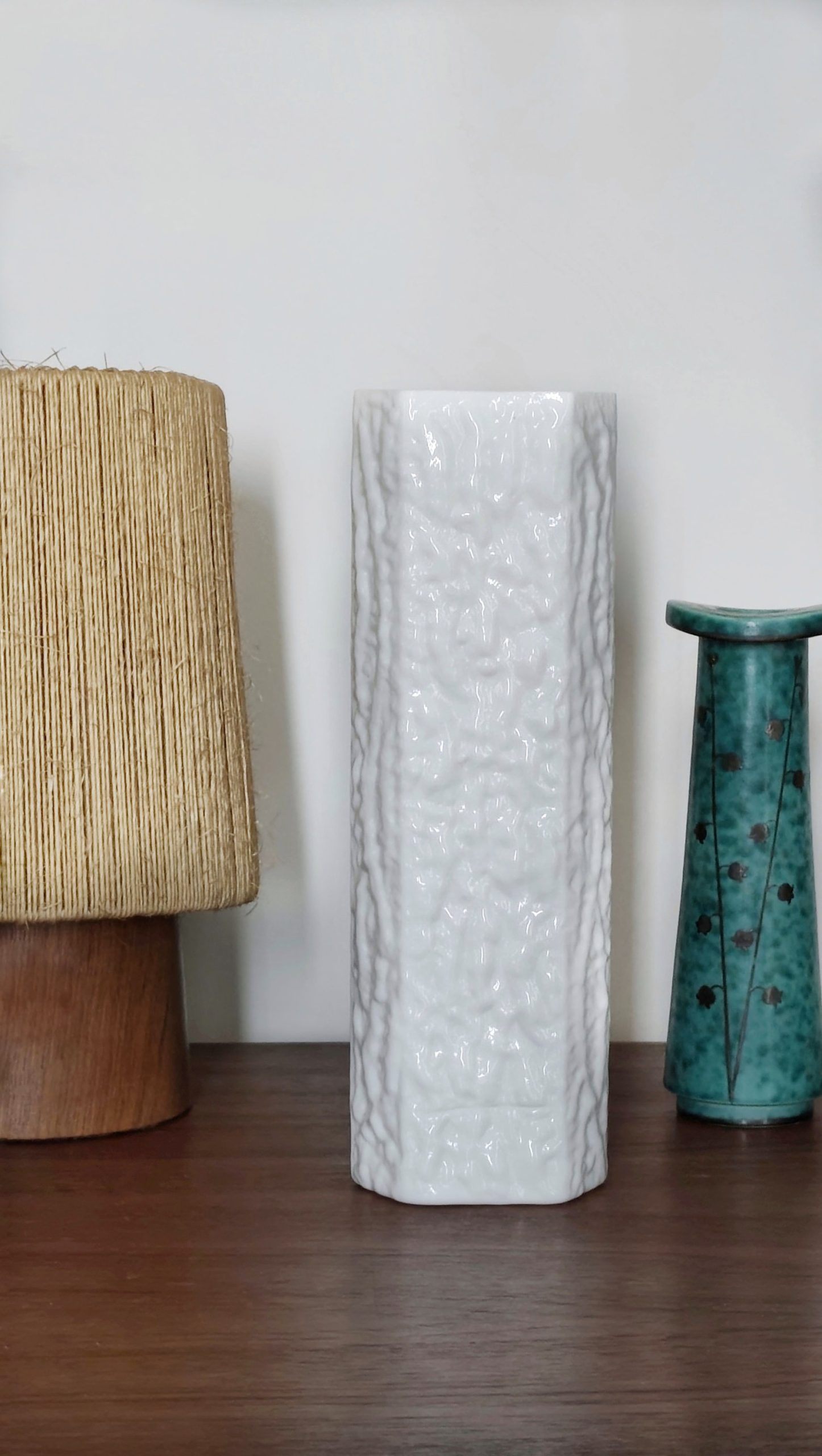 Vase en verre opalin blanc, de section hexagonale/facettée, présentant un décor en relief texturé rappelant l’écorce d’un arbre. Une pièce d’ Ingrid Glas (Ingrid Glashütte) produite en Allemagne de l’Ouest dans les années 60–70.